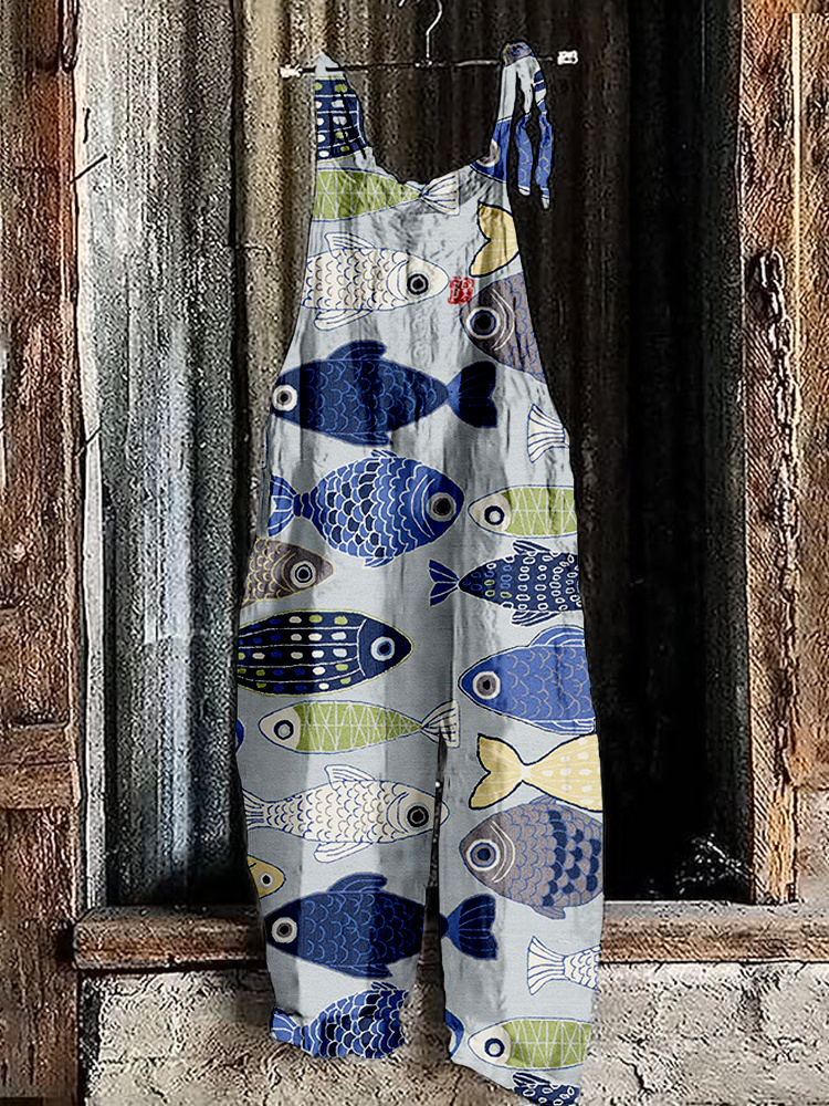 Vintage Fish Japanese Art Linen Blend Comfy Jumpsuit