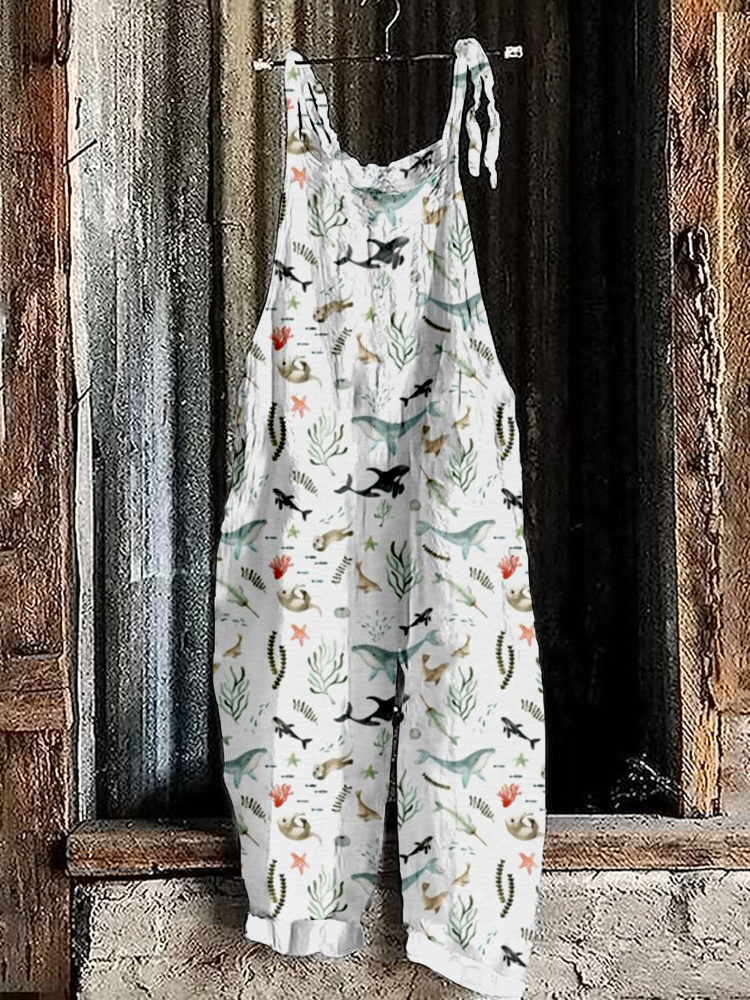 Pacific Ocean Animals Pattern Linen Blend Comfy Jumpsuit