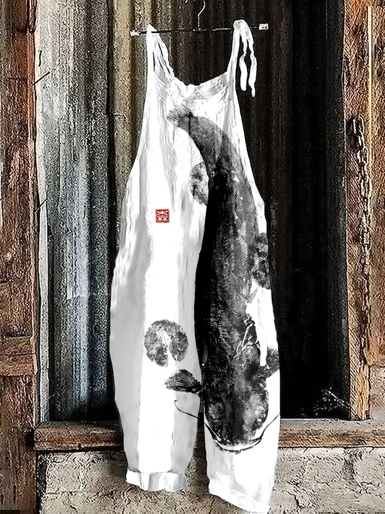 Vintage Japanese Art Koi Carp Printed Casual Jumpsuit