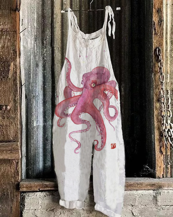 Japanese Colored Octopus Linen Blend Loose Casual Jumpsuit