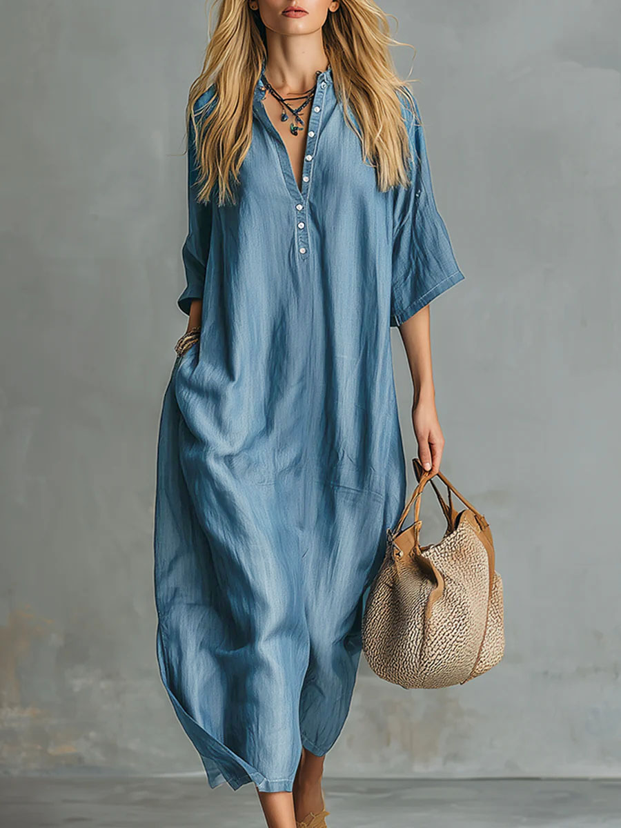 Women's V-neck 3/4 Sleeve Casual Loose Tencel Denim Dress