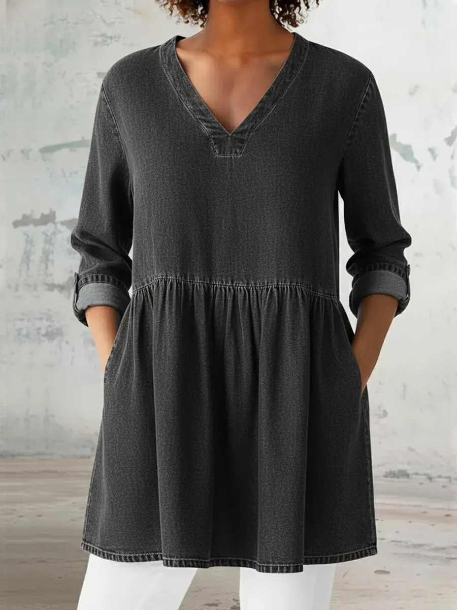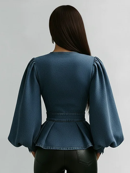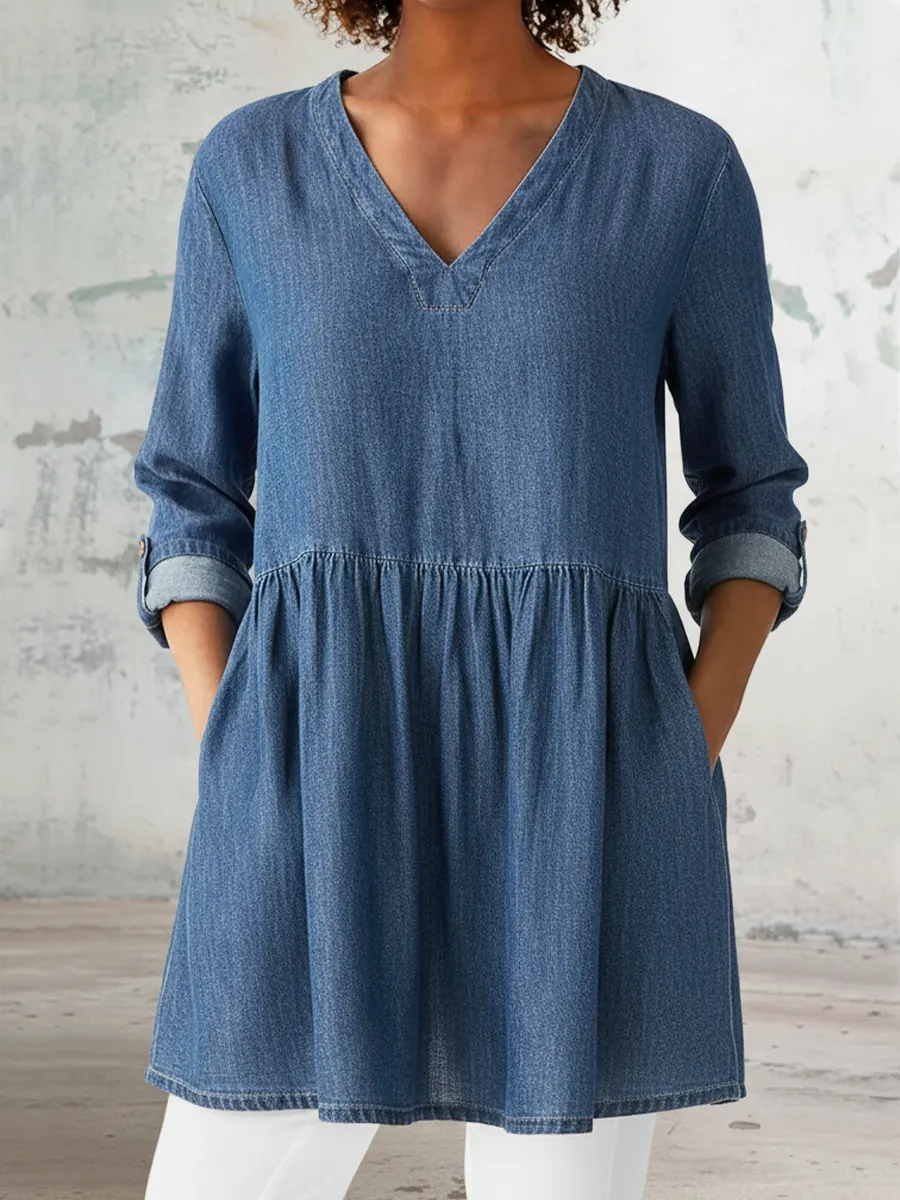 Women's Casual Denim V-Neck Ruffled Shirt