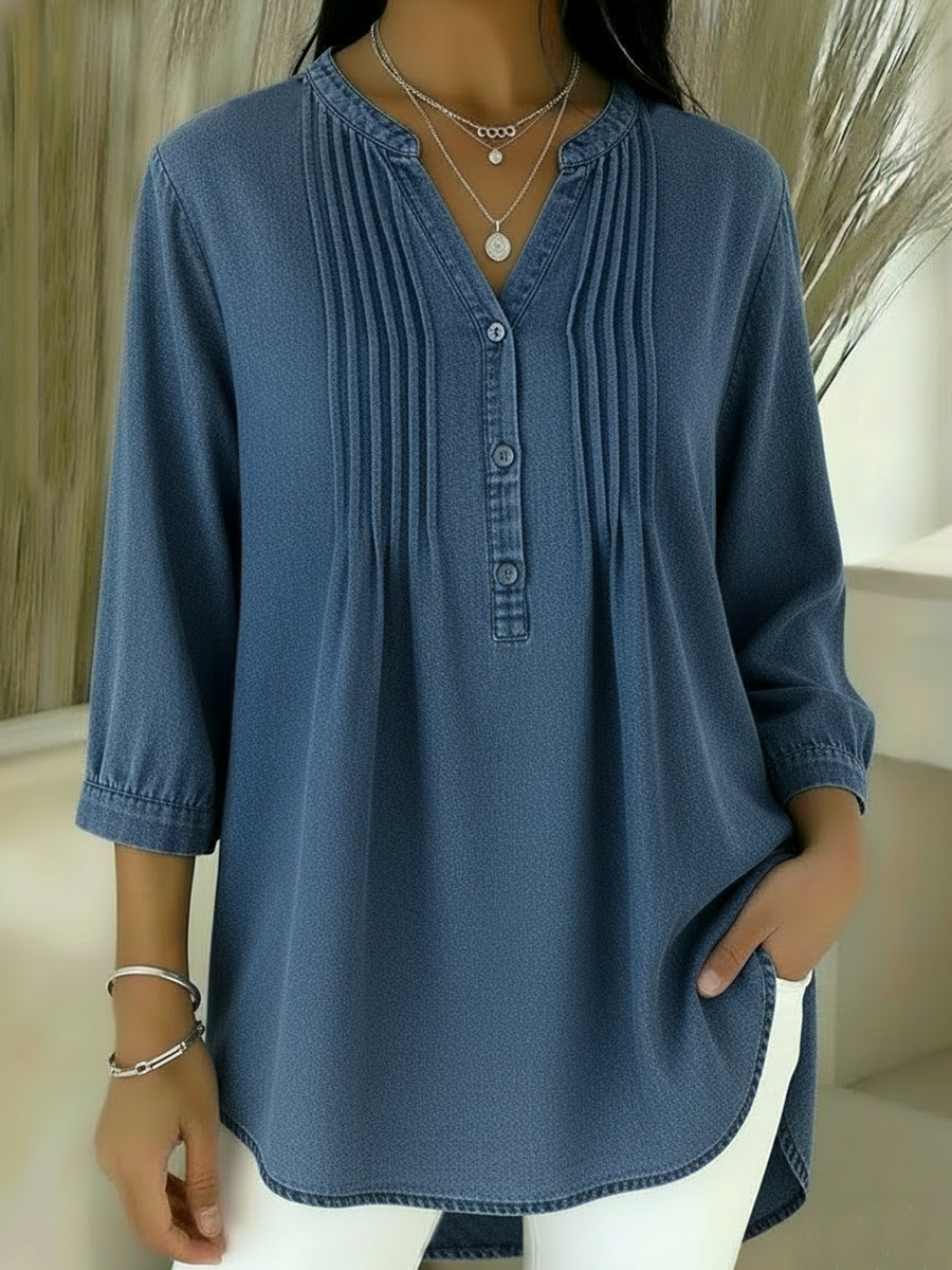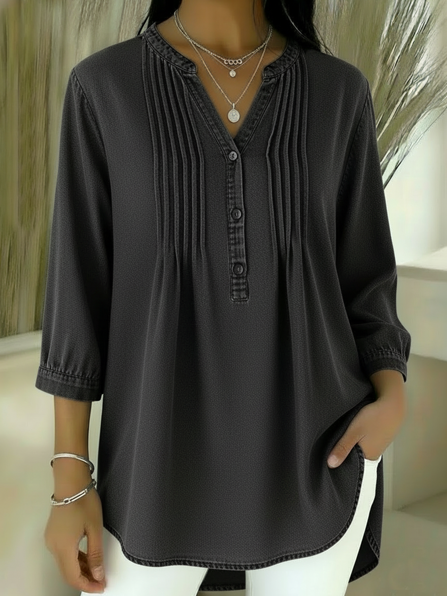 Casual Pleated Button-up Denim Top
