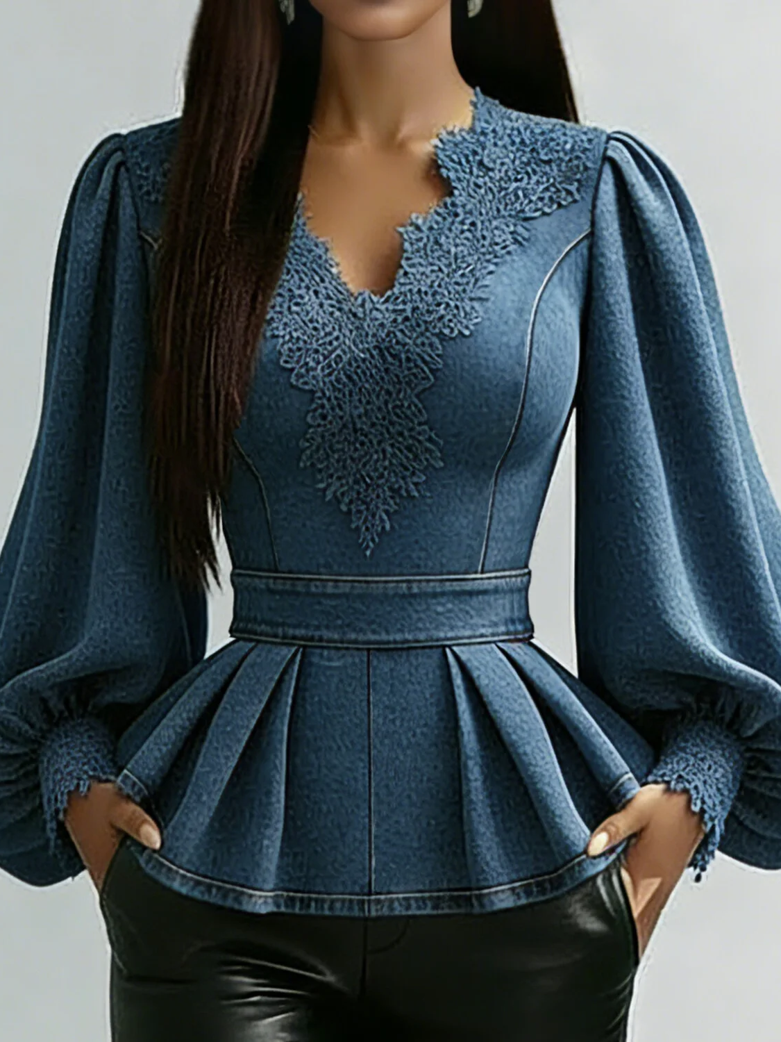 Elegant Lace-paneled Ruffled Hem Denim Shirt
