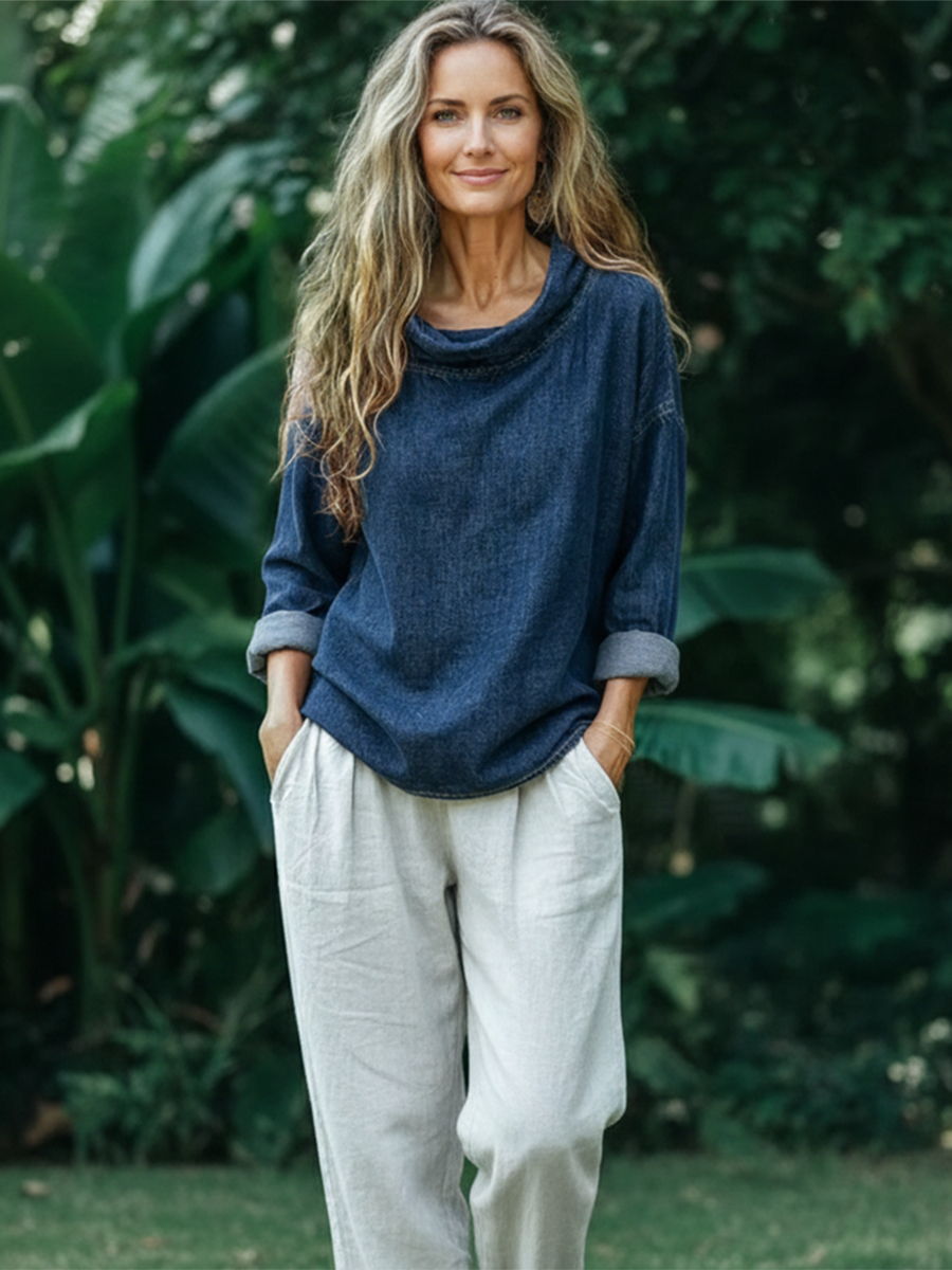 Elegant Draped-collar Denim Cotton Top