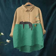Women's Casual Lying Cute Black Cat Floral Art Print Casual Lapel Blouse