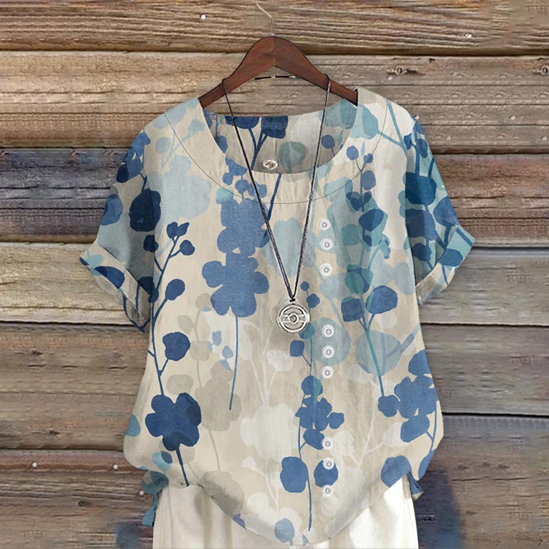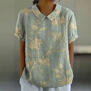 Women's Retro Literary Watercolor Floral Art Print Casual Short Sleeve Blouse