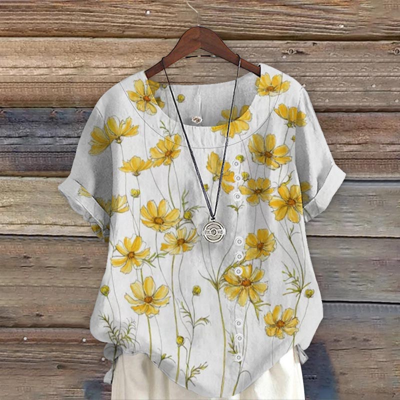Women's Yellow Cosmos Flowers Art Print Casual Short Sleeve Blouse