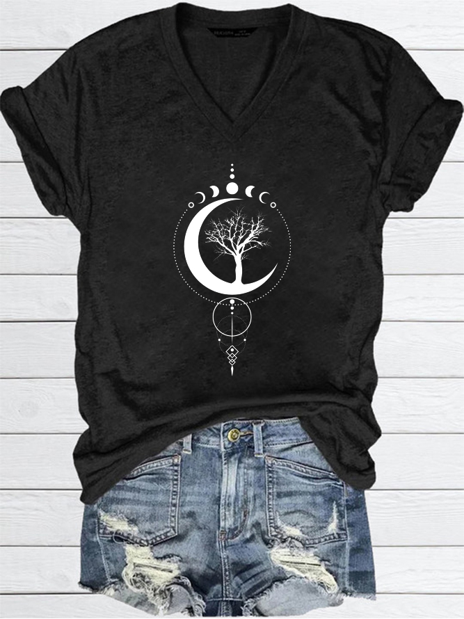 Moon And Tree Printed Women's V-neck T-shirt