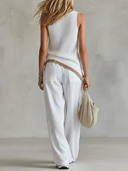 Women's Crew-neck Sleeveless Loose-fit Knit Top & Cotton-linen Casual Wide-leg Pants Set