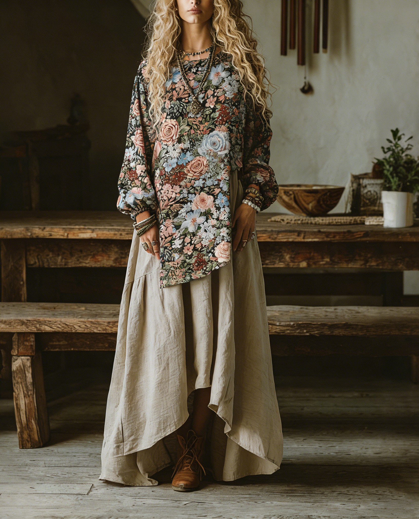 Women's Comfortable loose printed top + solid color skirt cotton and linen two-piece set
