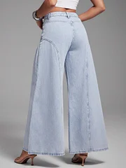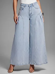 Women's High Waist Pocketed Pleated Wide Leg Loose Casual Denim Pants