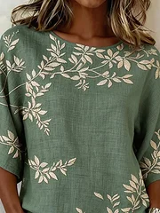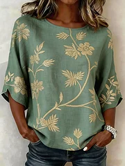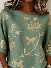 Women's Casual Round Neck Printed Cotton Linen Top