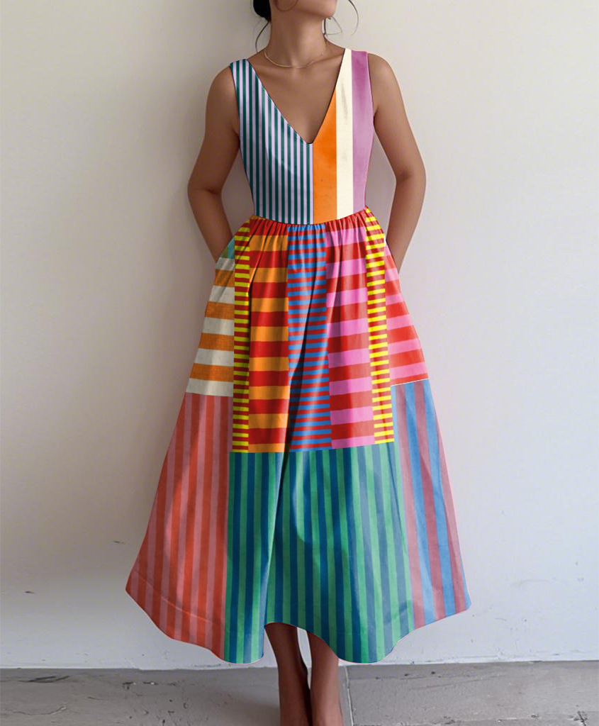 Retro Elegant Abstract Print V Neck Sleeveless Dress