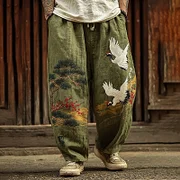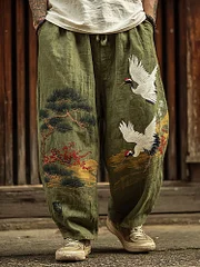 Men's Vintage Japanese Pine Crane Art Embroidery Art Linen Blended Casual Pants