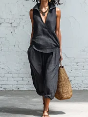 Simple collared shirt and wide-leg pants two-piece set