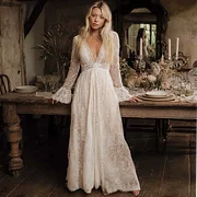 Lace Long Sleeve V-Neck Boho Wedding Dress With Flared Sleeves And Deep Plunge Neckline