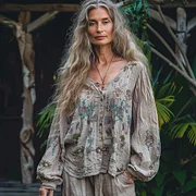 Women's Vintage Linen Flower Print Casual Long-sleeved Shirt