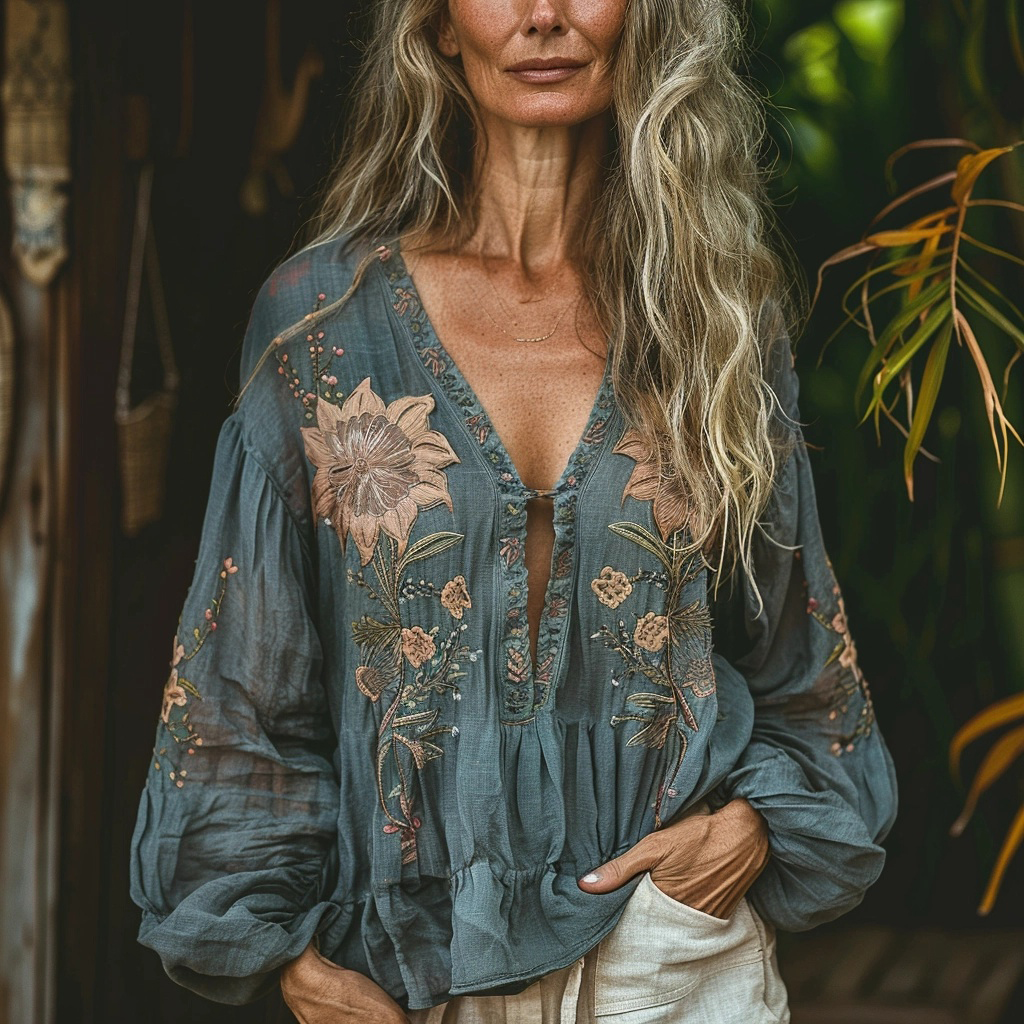 Casual Bohemian Linen Long Sleeve Top