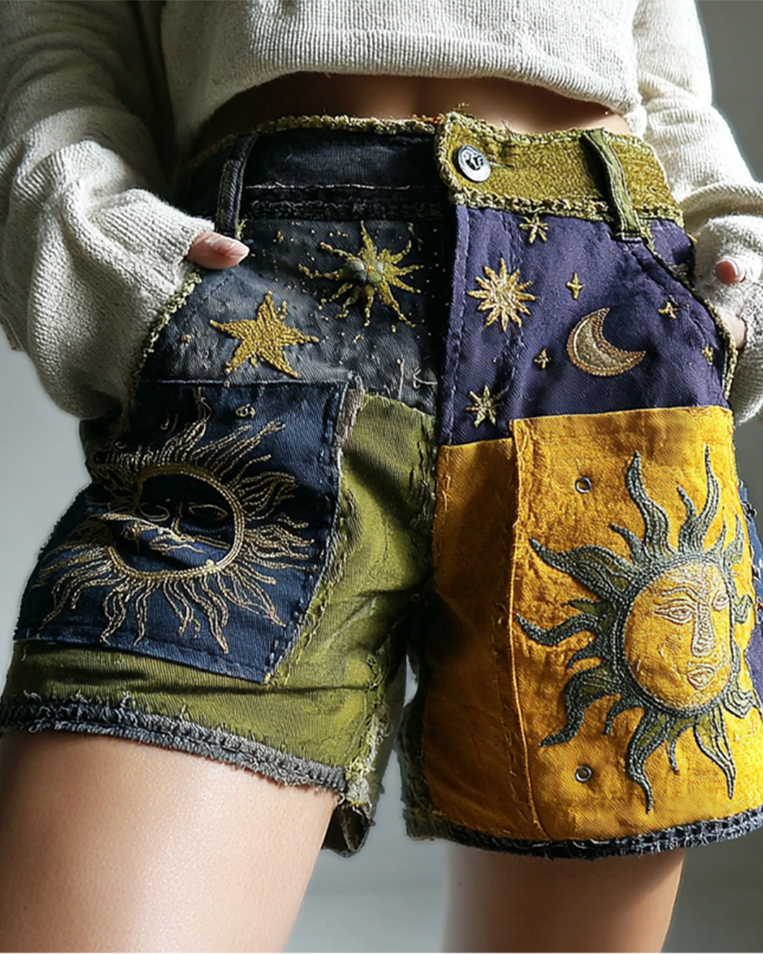 Women's Star and Moon Embroidered Contrast Color-Paneled Shorts 0223