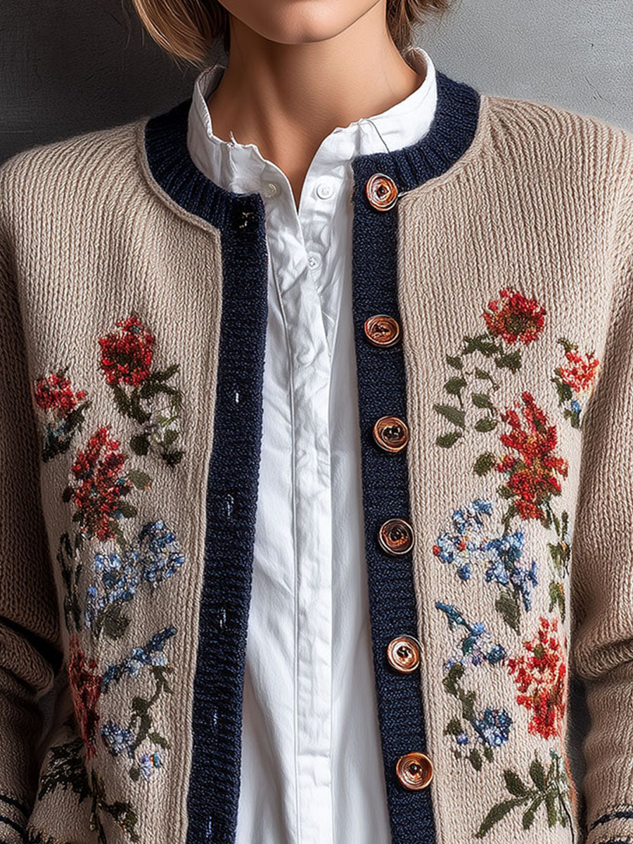 Retro Floral Embroidered Beige Knit Cardigan With Navy Trim