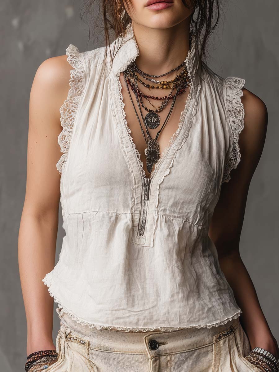 Vintage Zippered Collar Lace-trimmed Cotton Linen Tank Top
