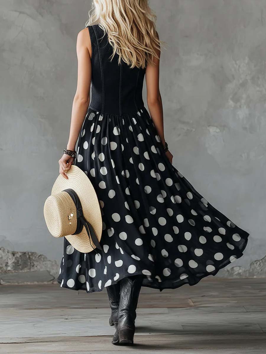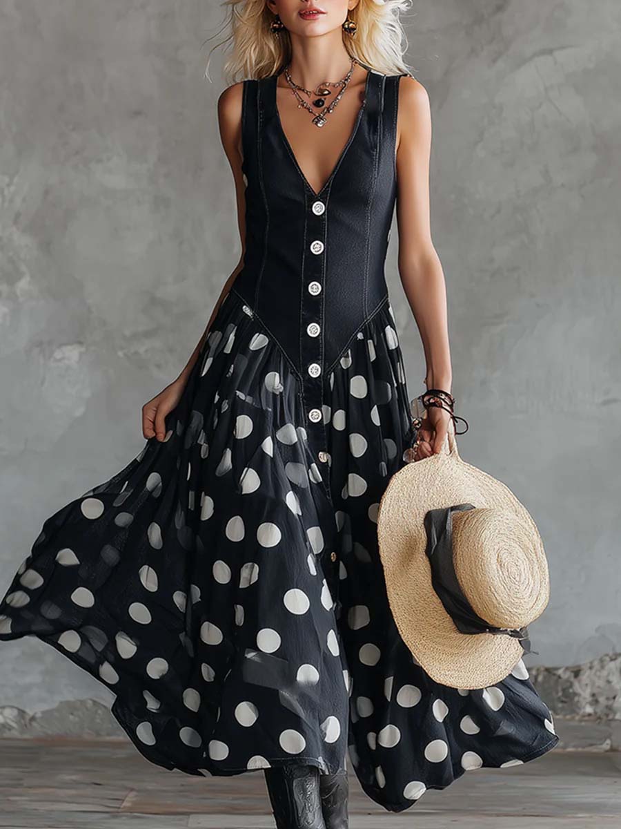 Women's V-neck Sleeveless Casual Loose Denim Patchwork Polka Dot Dress