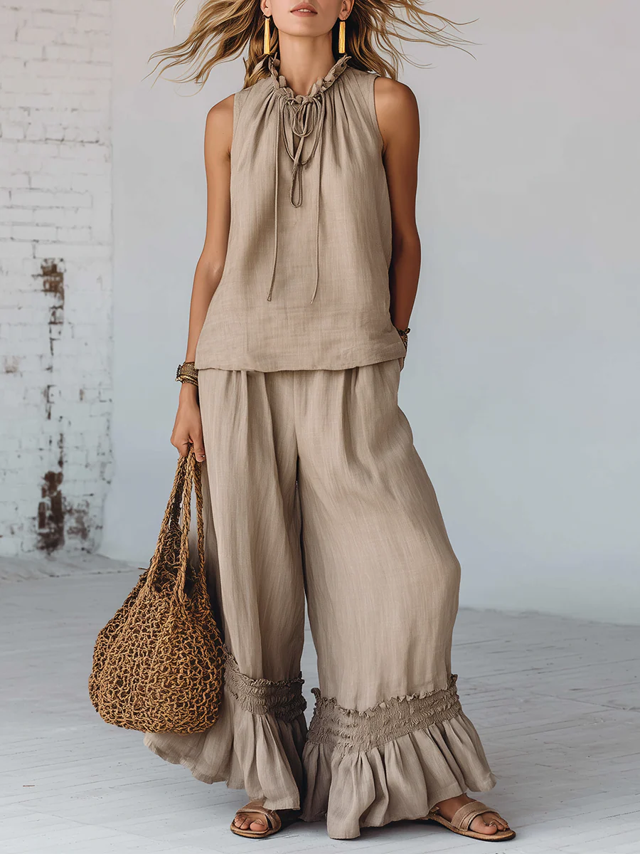 Bohemian Lace-up Blouse And Ruffled Wide-leg Pant Linen Set