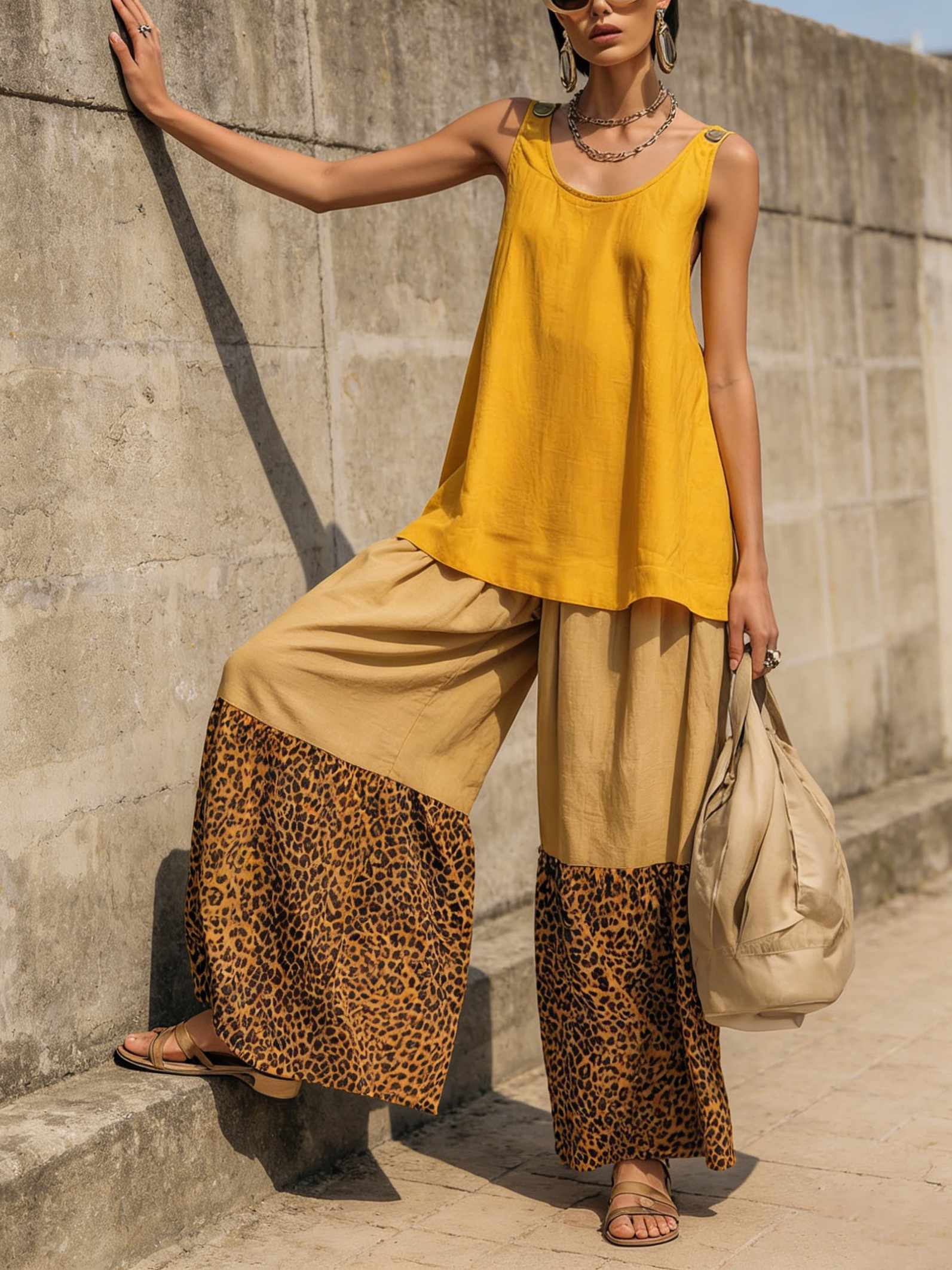 Casual Leopard Print Color-block Loose Cotton Two-piece Set
