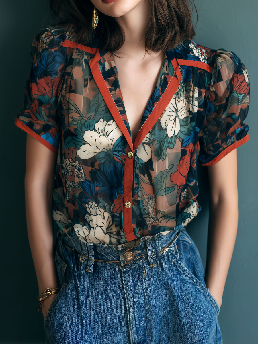 Vintage Sheer Floral Print Blouse With Contrast Trim