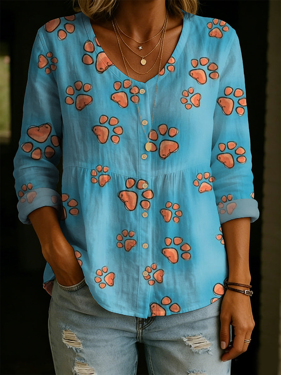 Women's Fun And Cute Dog Paw Print Decorative Patterns Linen And Cotton Shirt
