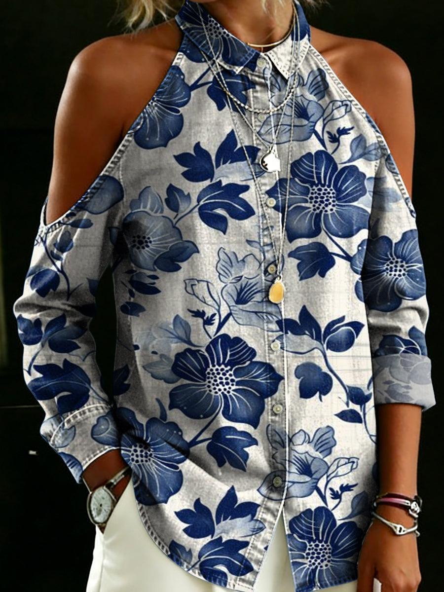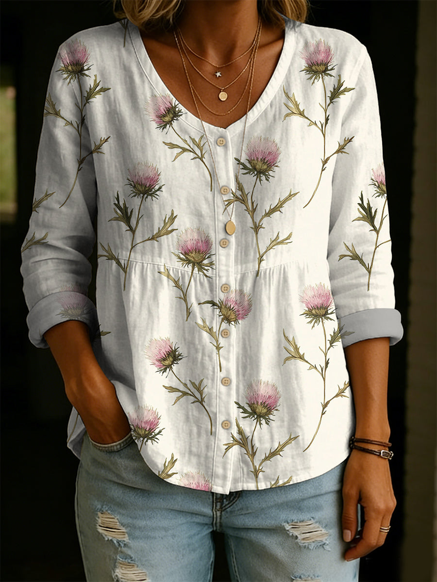 Women's Elegant Tulip Flower Decorative Pattern Linen And Cotton Shirt