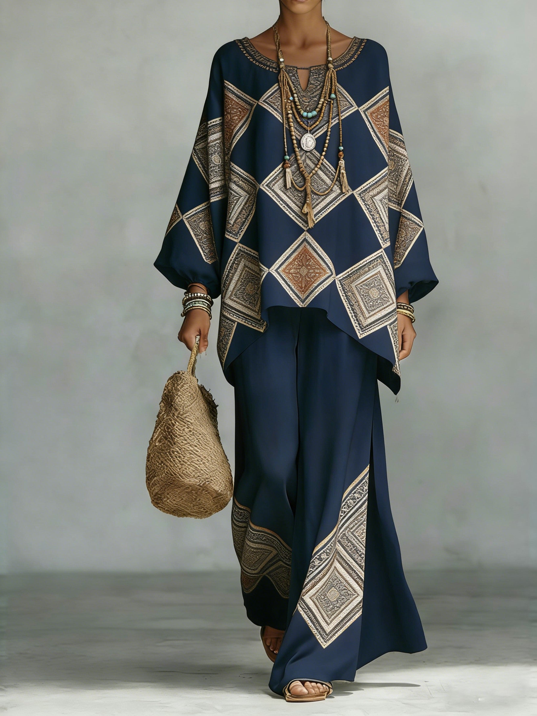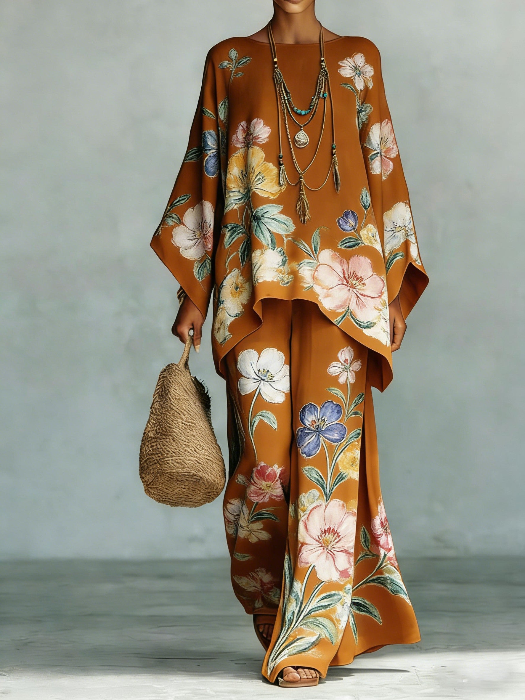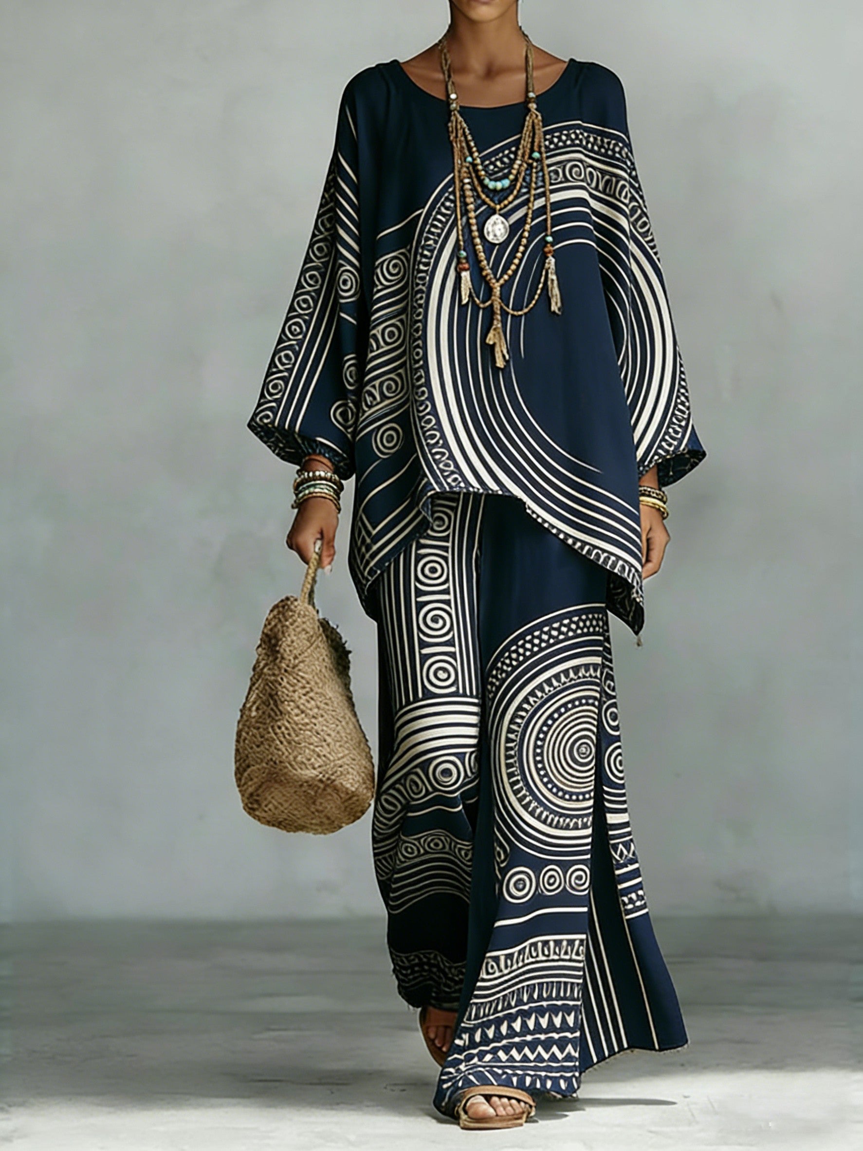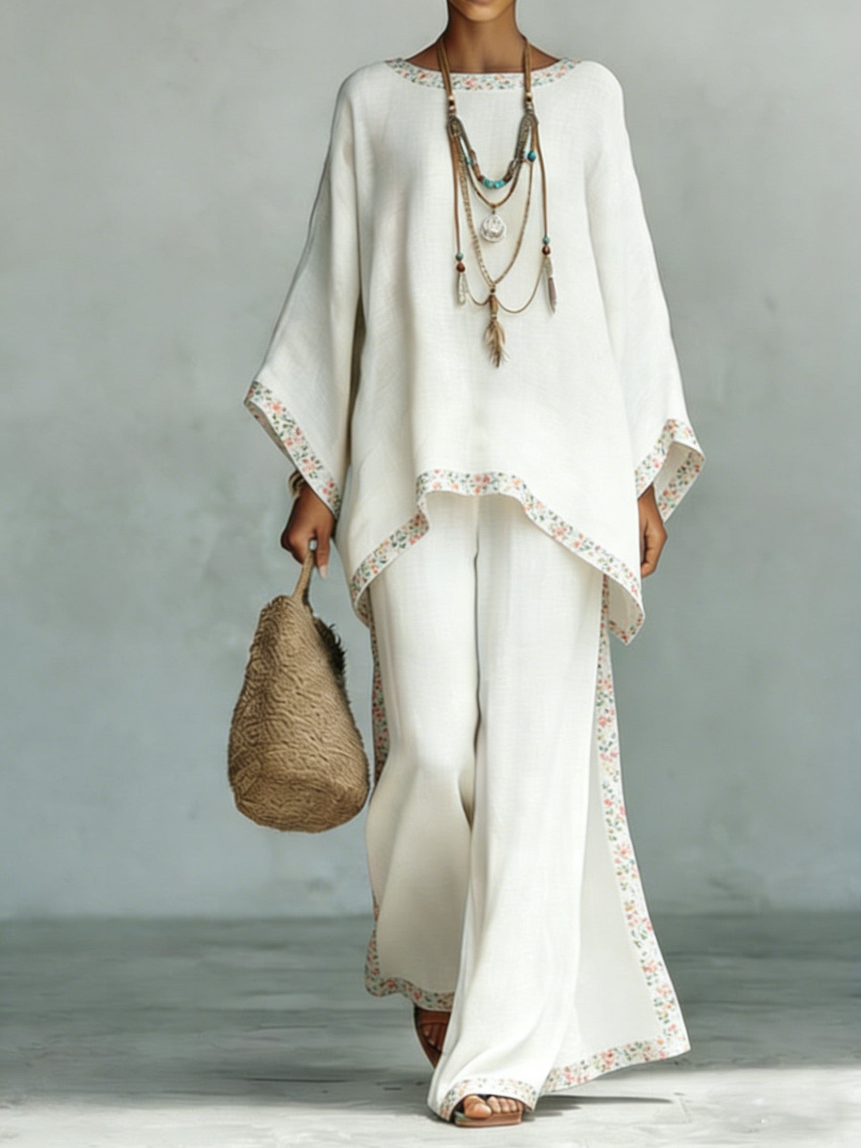 Women's Comfortable and loose print pattern cotton and linen wide-leg pants two-piece set