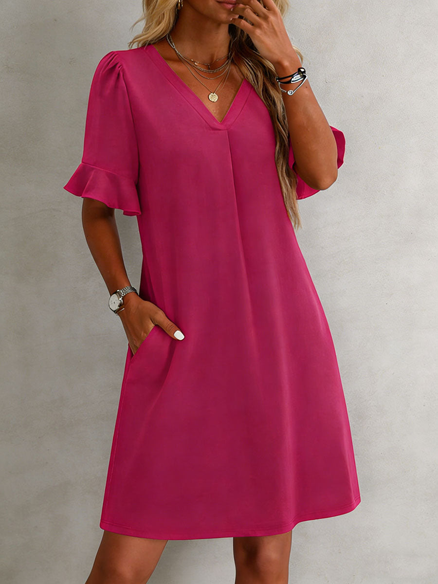 Women's Solid Color V-neck Loose Short Sleeve Casual Pocket Dress