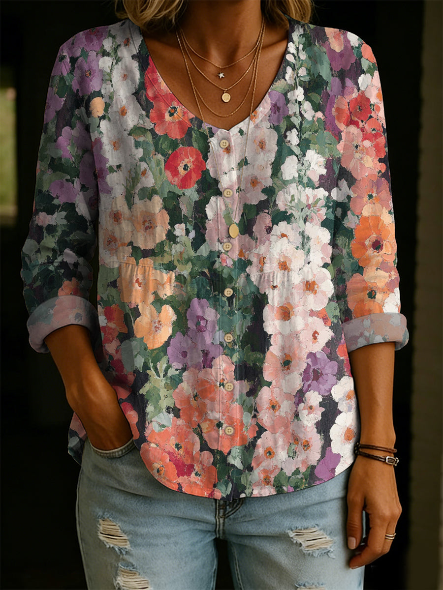 Women's Painting Art Oil Painting Floral Decorative Pattern Linen And Cotton Shirt
