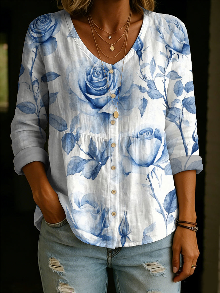 Women's Elegant Rose Floral Decorative Pattern Linen And Cotton Shirt