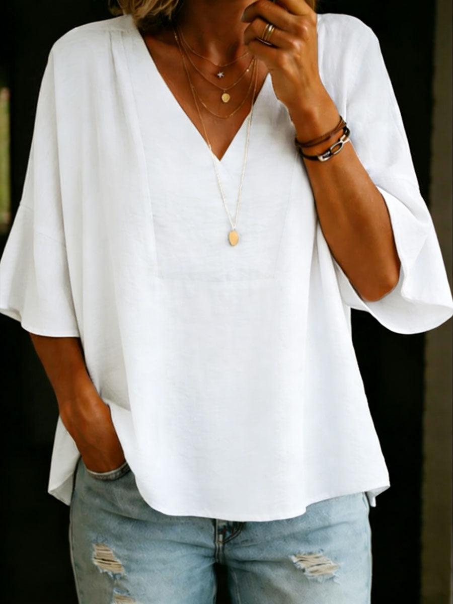 Women's Solid Color V-neck Linen Cotton Shirt