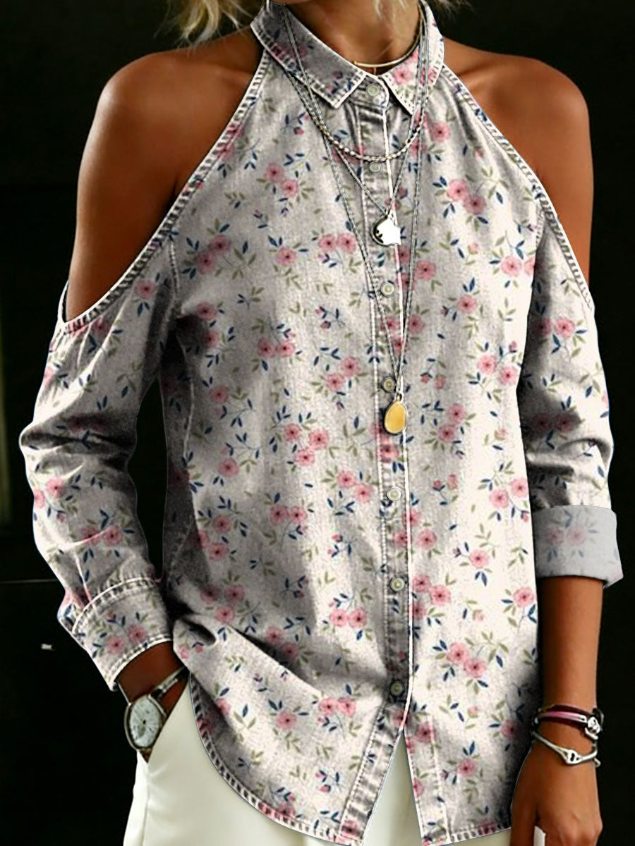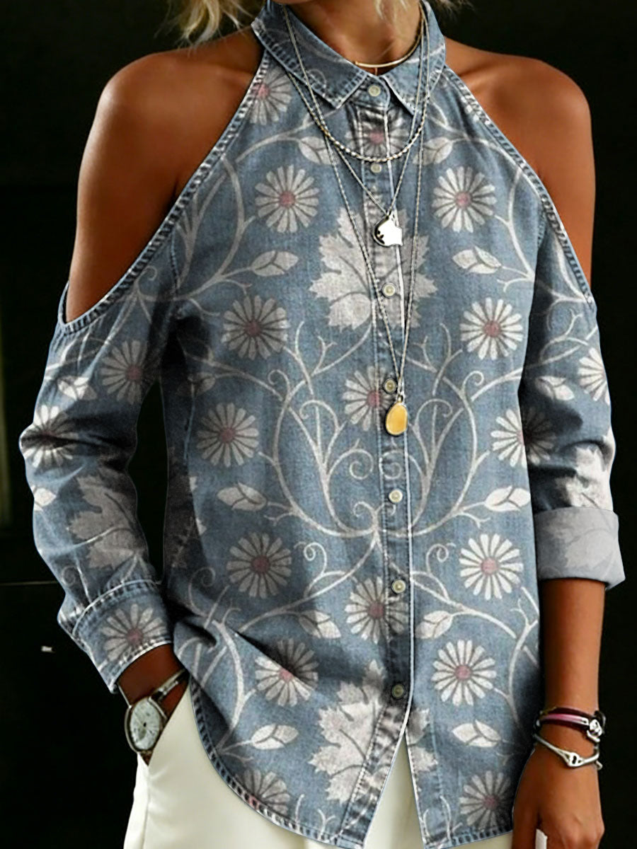 Women's Floral Pattern Art Print Casual Loose Denim Blouse Shirt