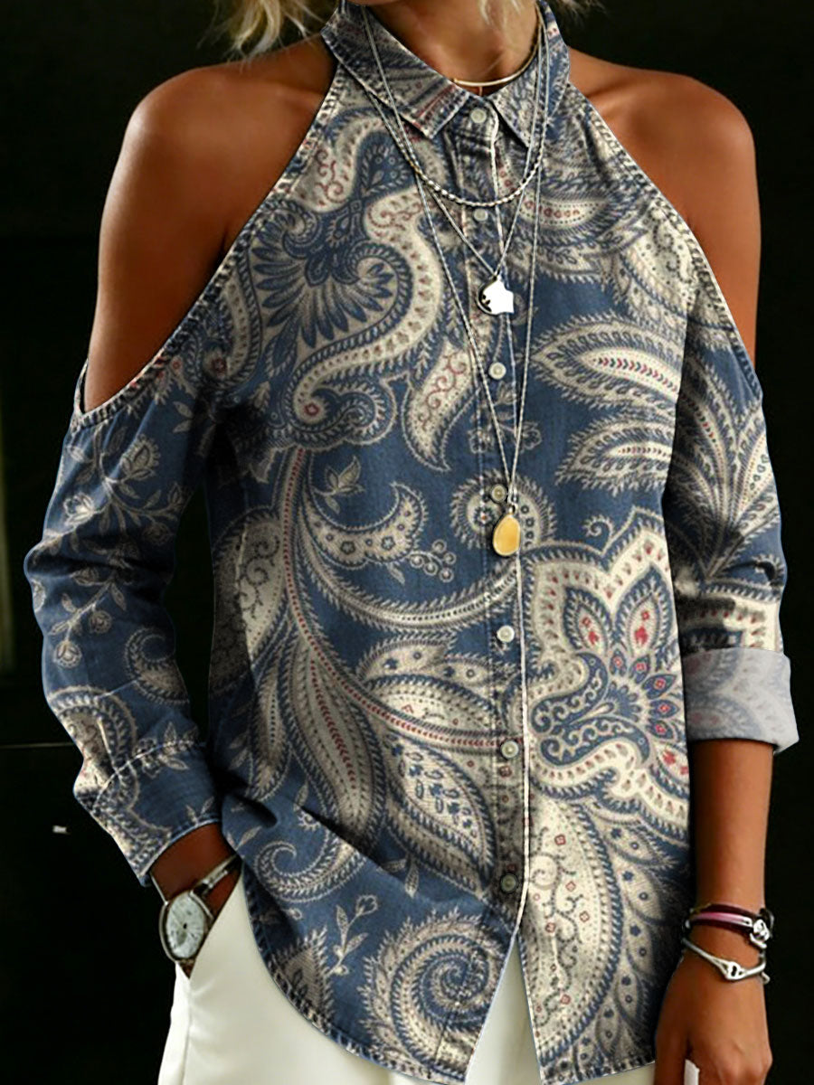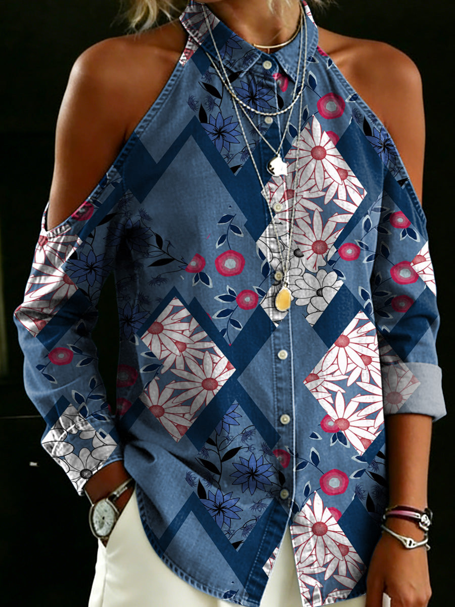 Women's Geometric Rhombus Flower Decorative Pattern Casual Long Sleeve Denim Shirt