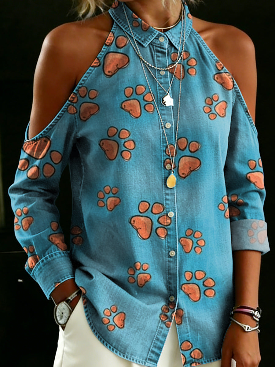 Women's Fun And Cute Dog Paw Print Decorative Patterns Casual Long Sleeve Denim Shirt