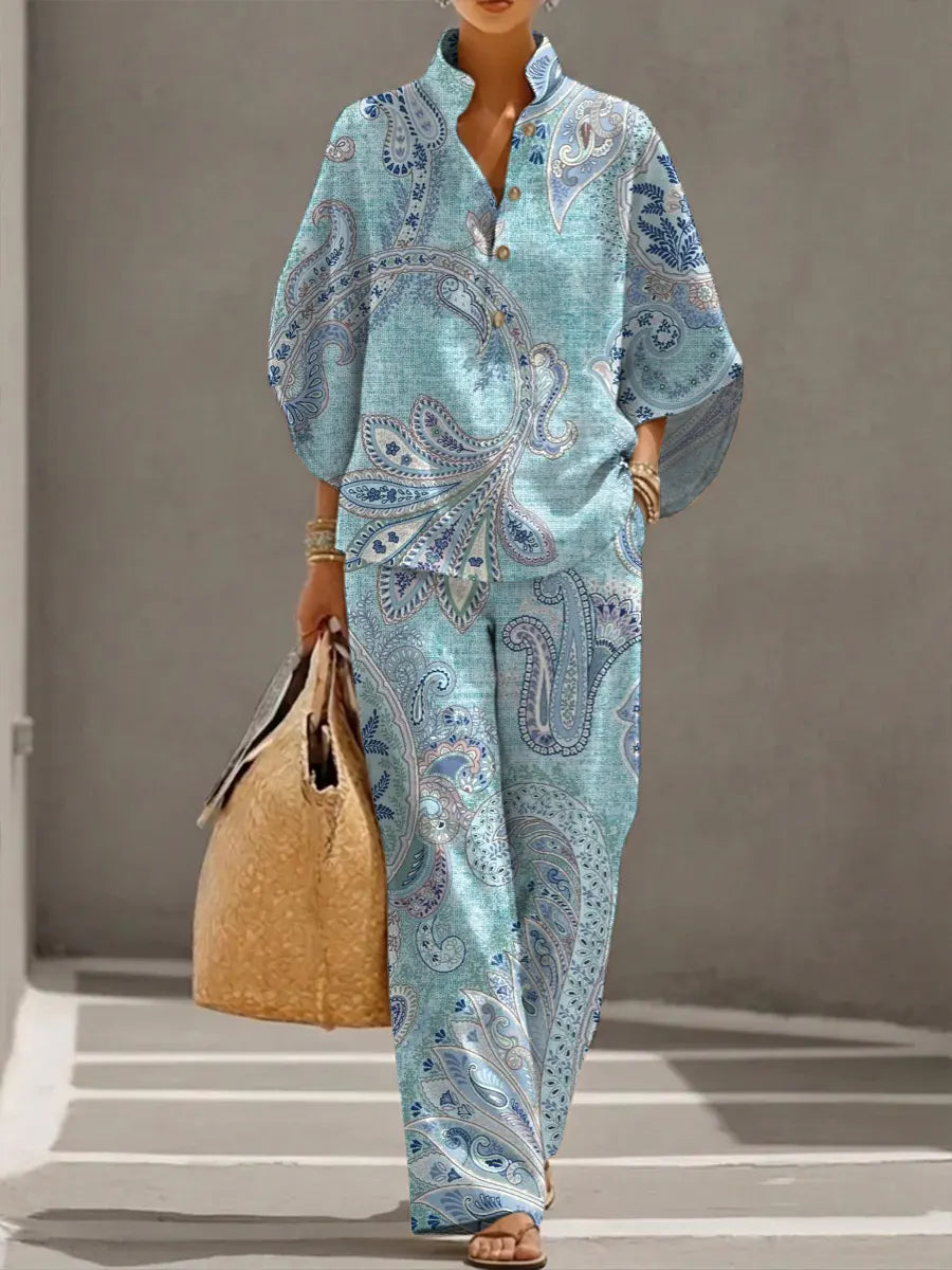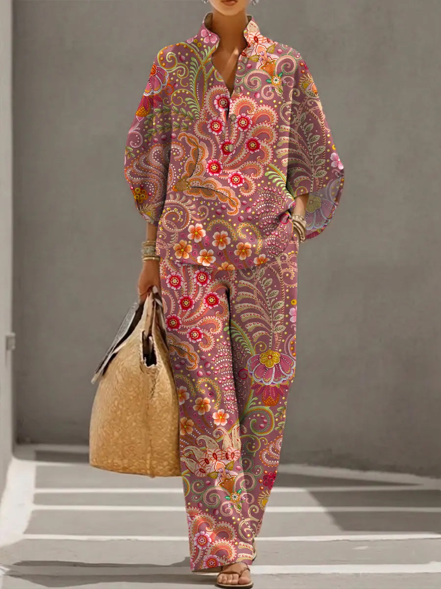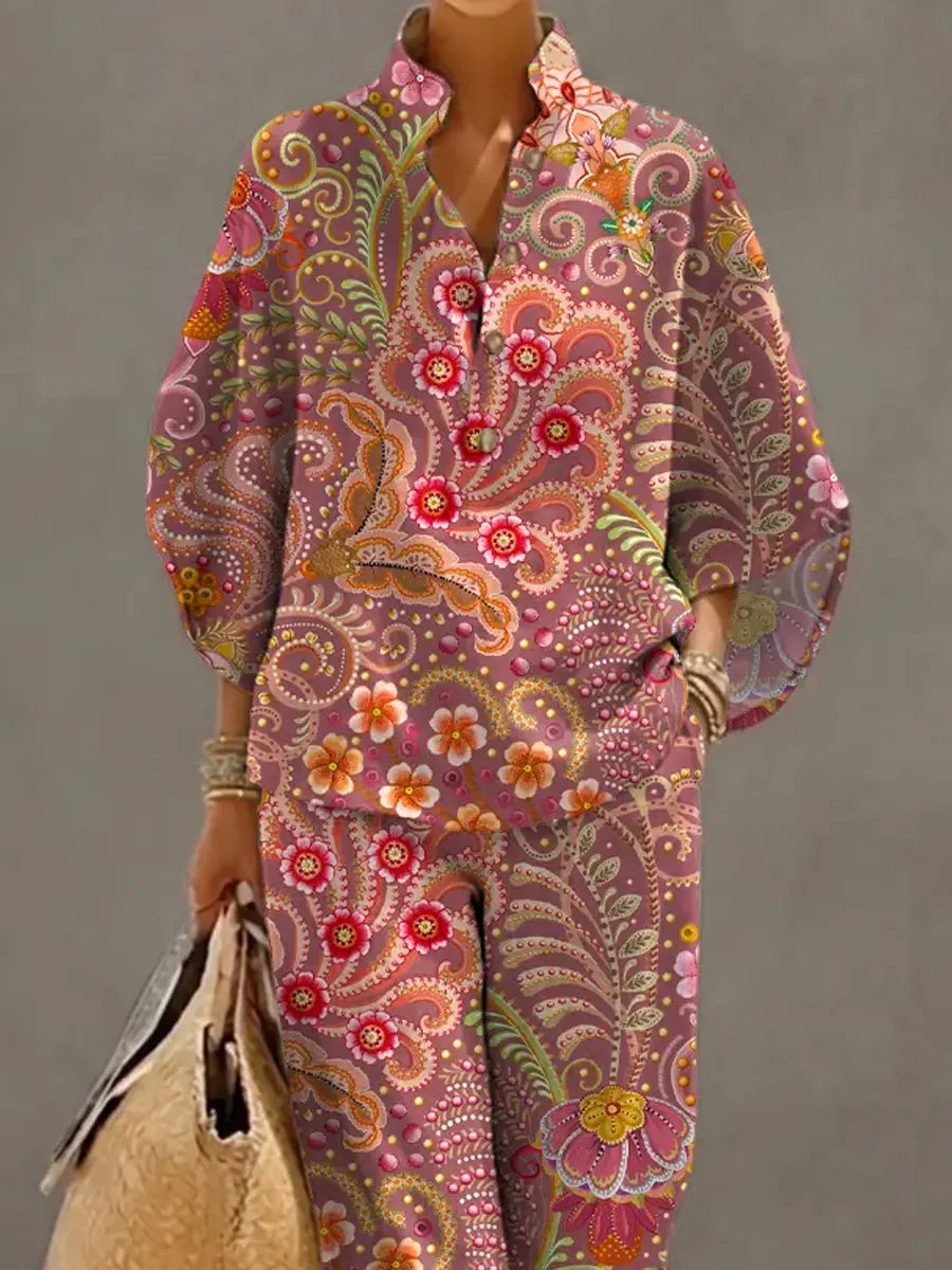 Women's Retro Art Print Casual 3/4 Sleeve Top And Pants Cotton Linen Suits