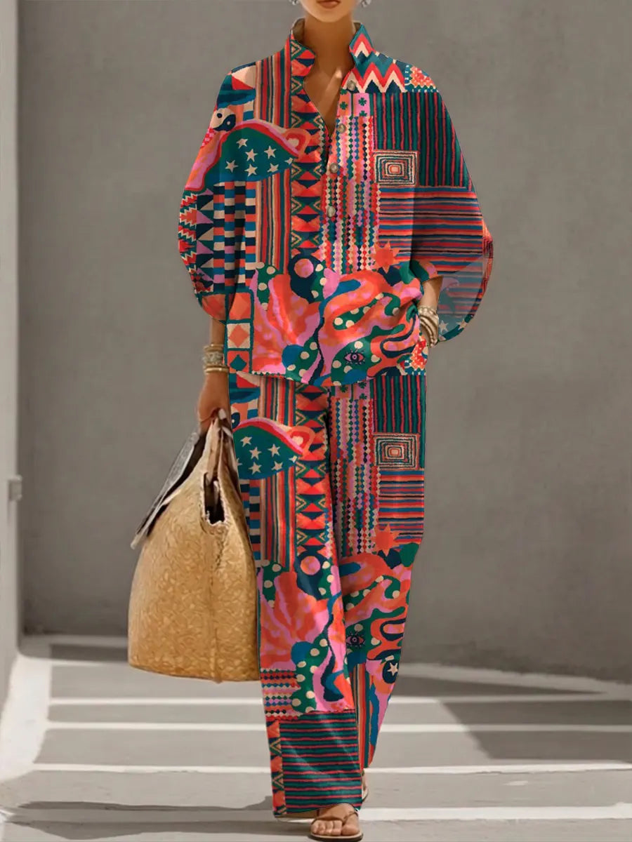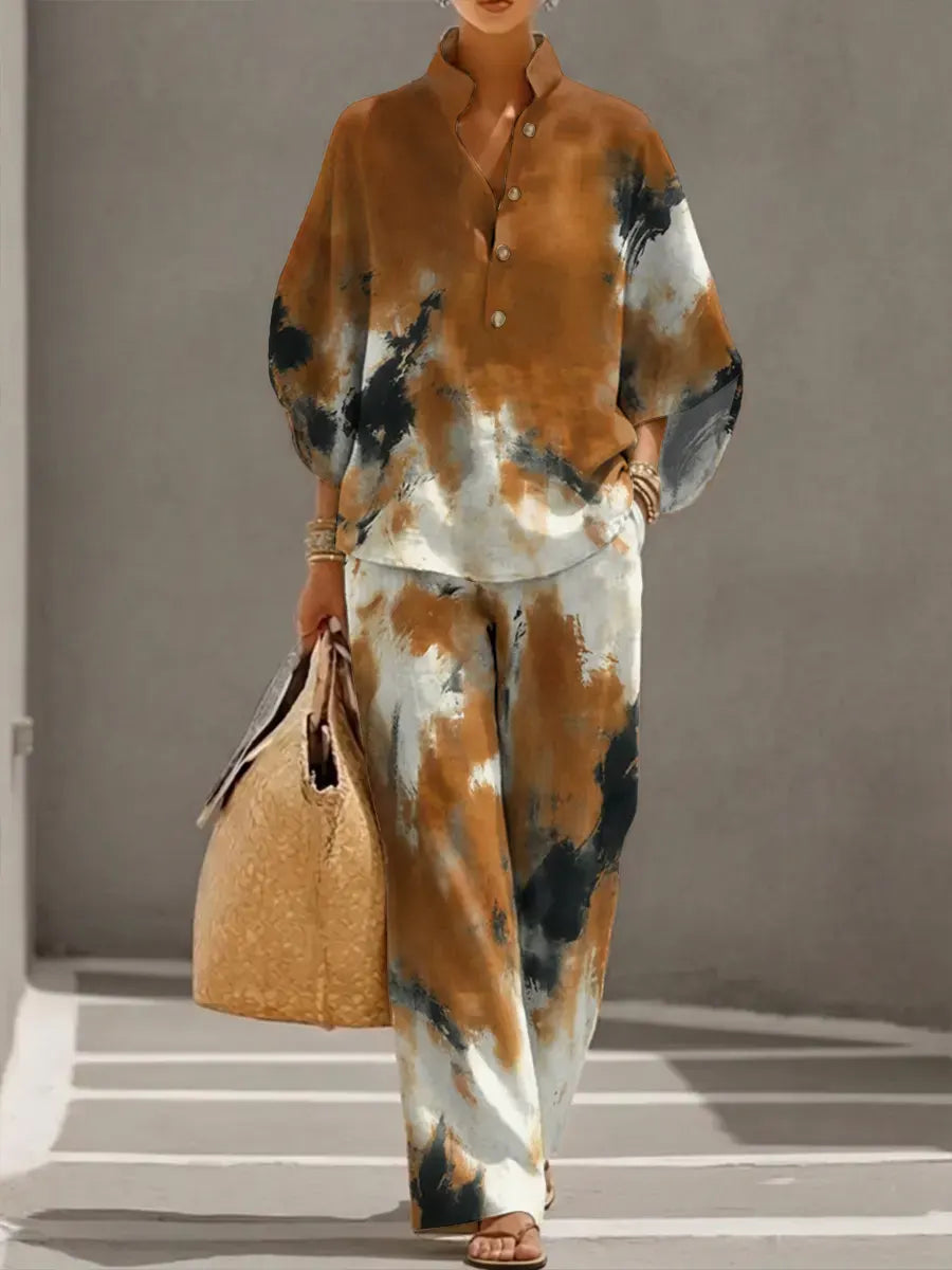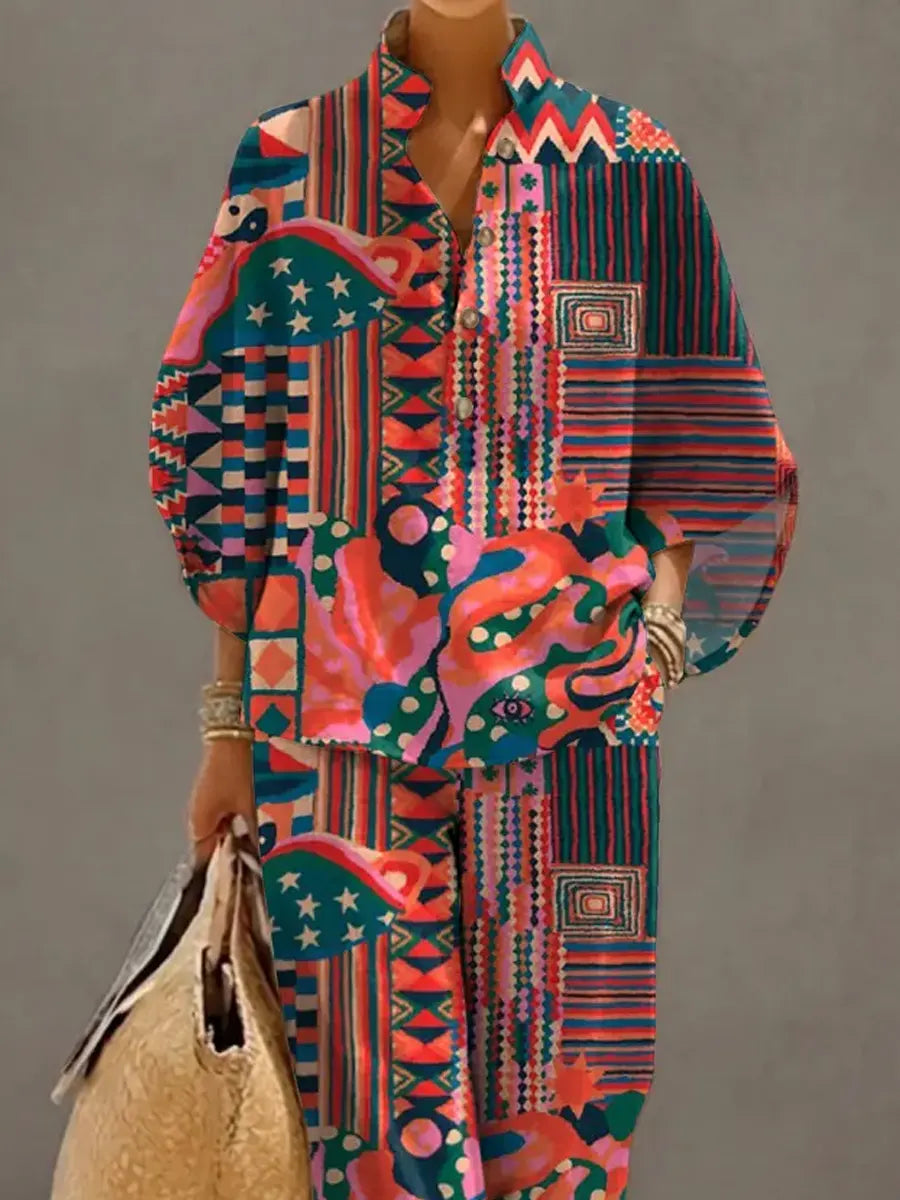 Women's Retro Art Print Casual 3/4 Sleeve Top And Pants Cotton Linen Suits