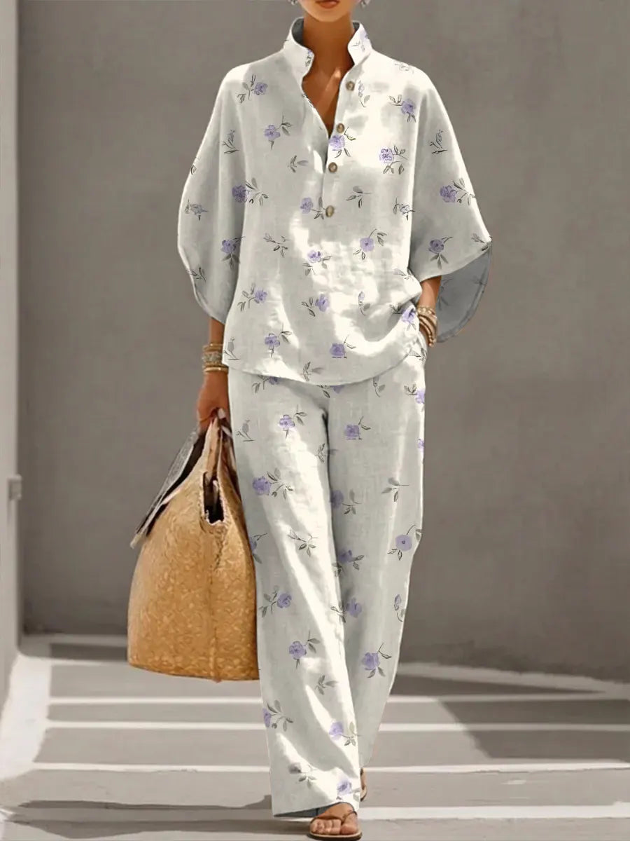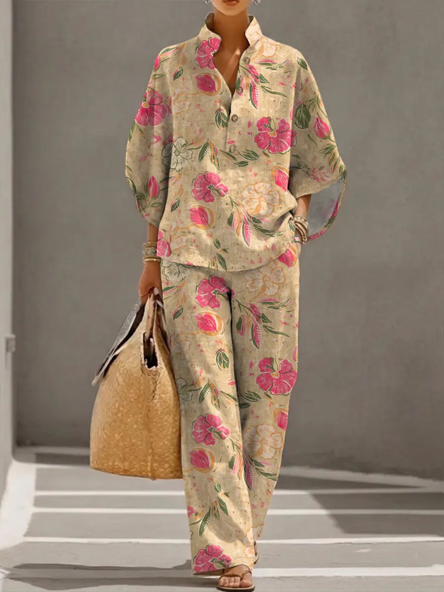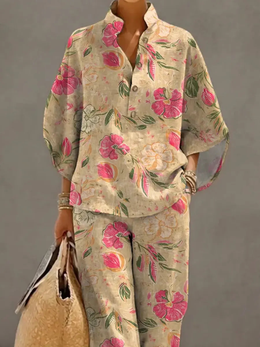 Women's Floral Print Casual Cotton-linen Two-piece Set