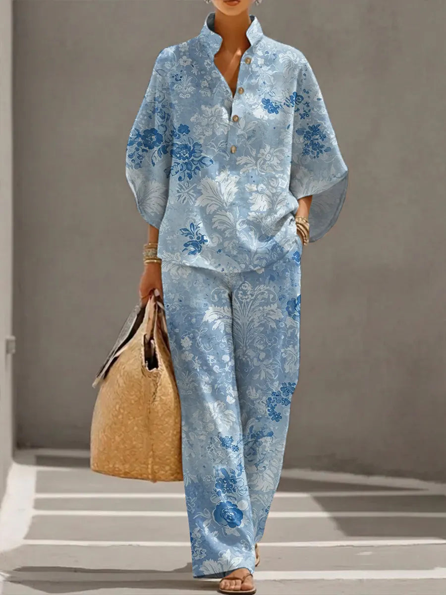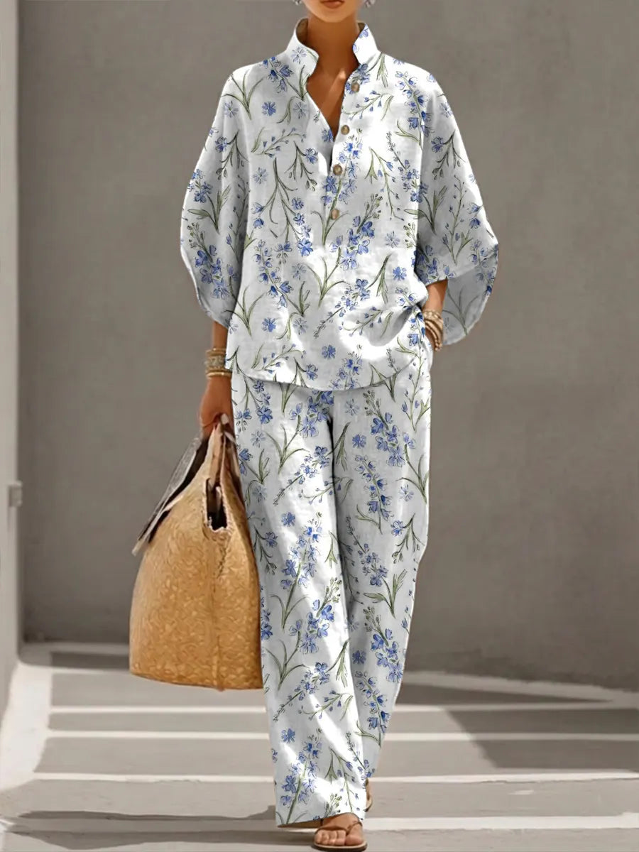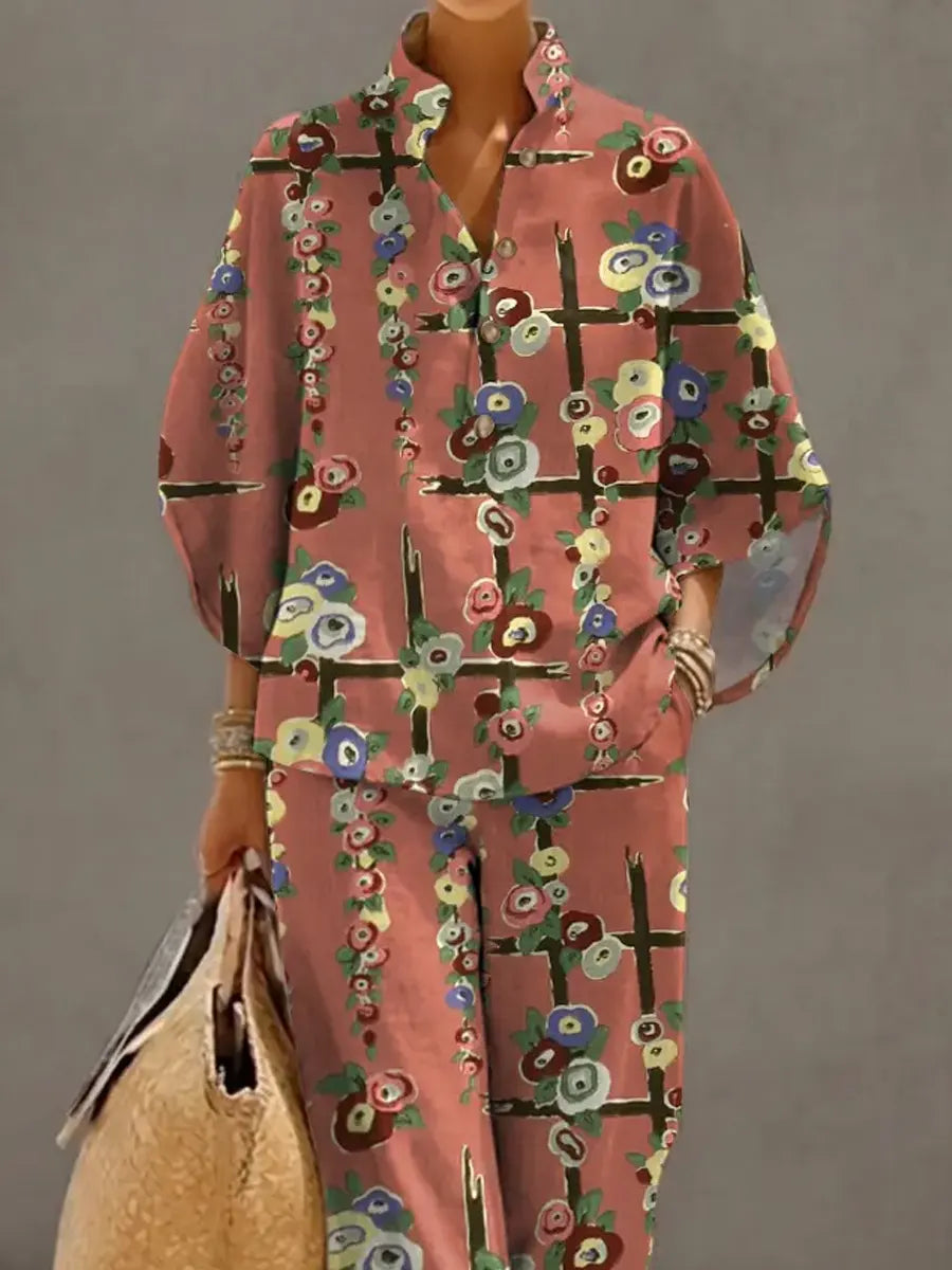 Women's Floral Print Casual Cotton-linen Two-piece Set