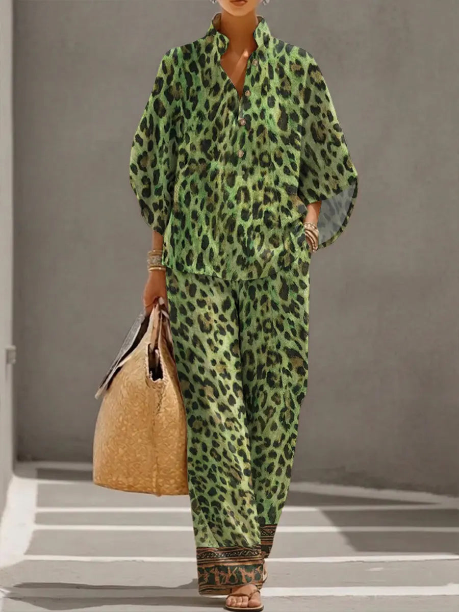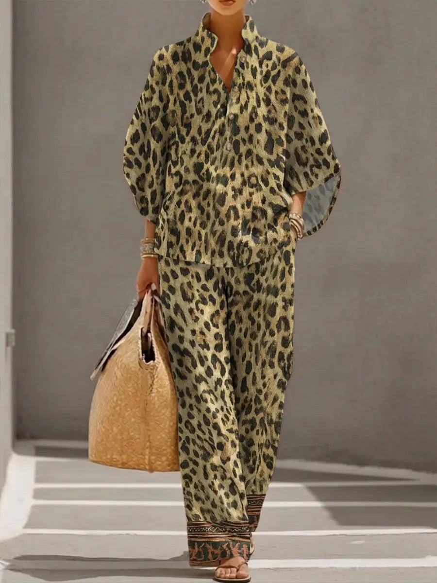 Women's Retro Leopard Art Print Casual 3/4 Sleeve Top And Pants Cotton Linen Suits
