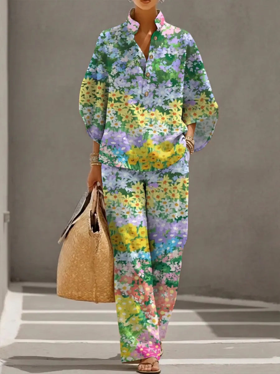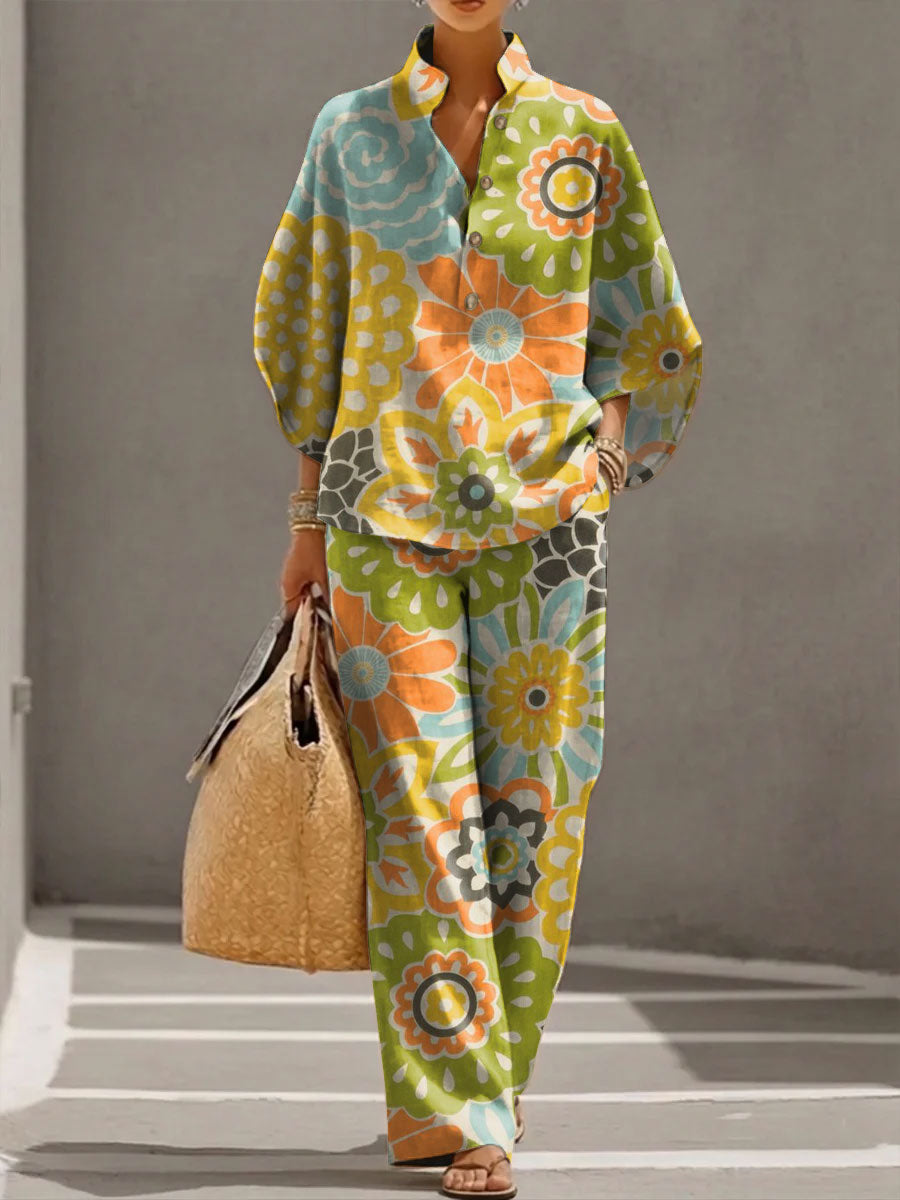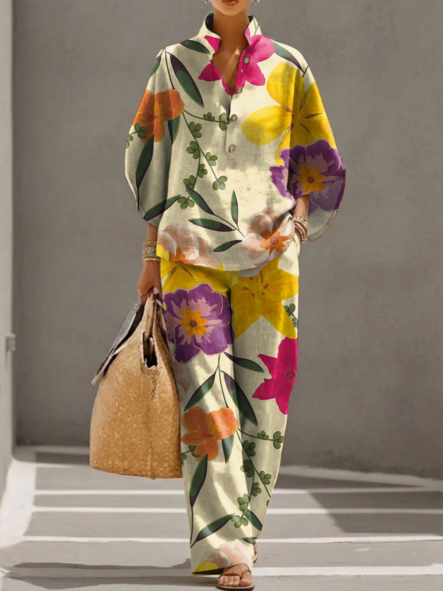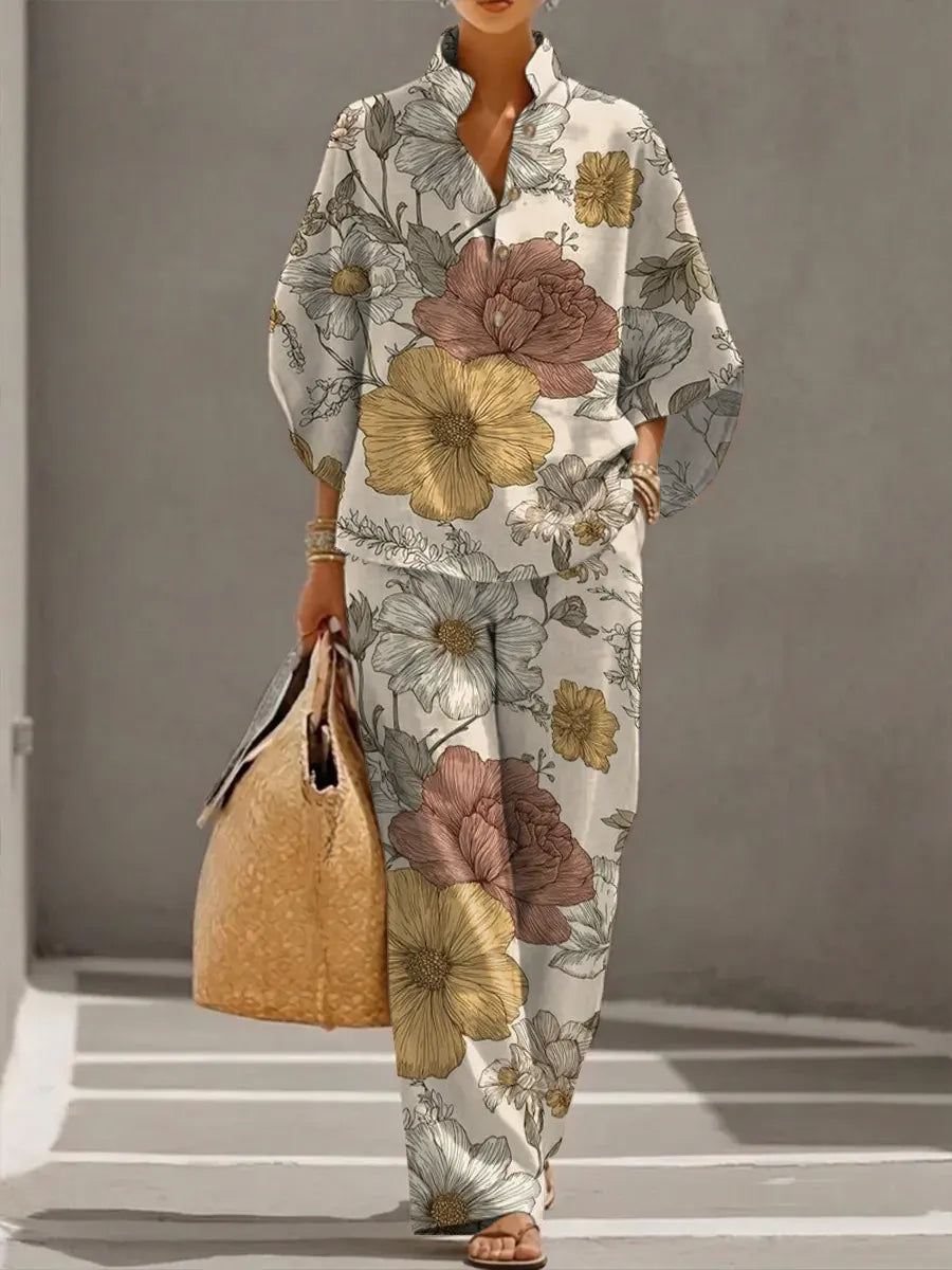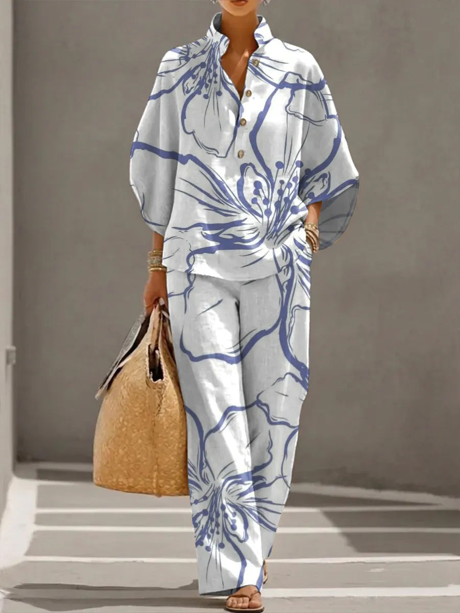 Women's Floral Art Print Casual 3/4 Sleeve Top And Pants Cotton Linen Suits