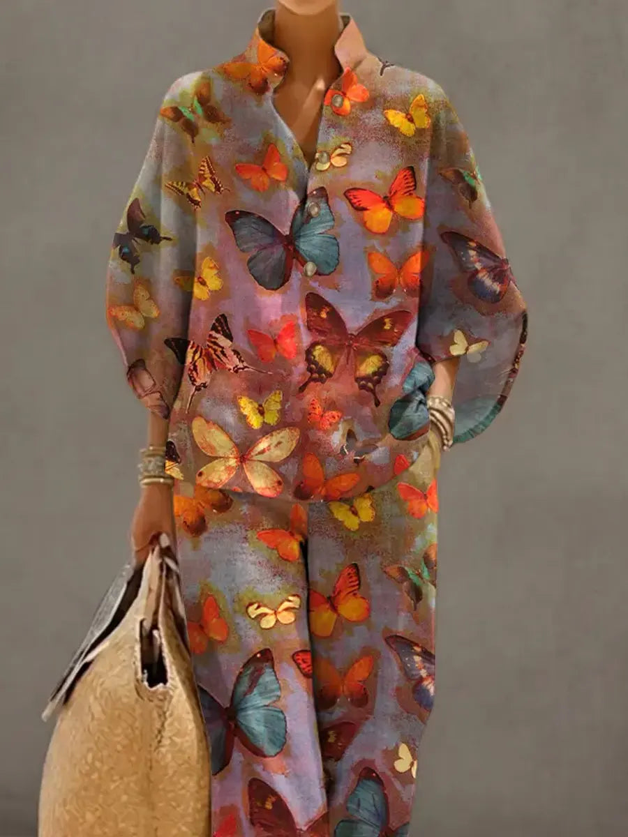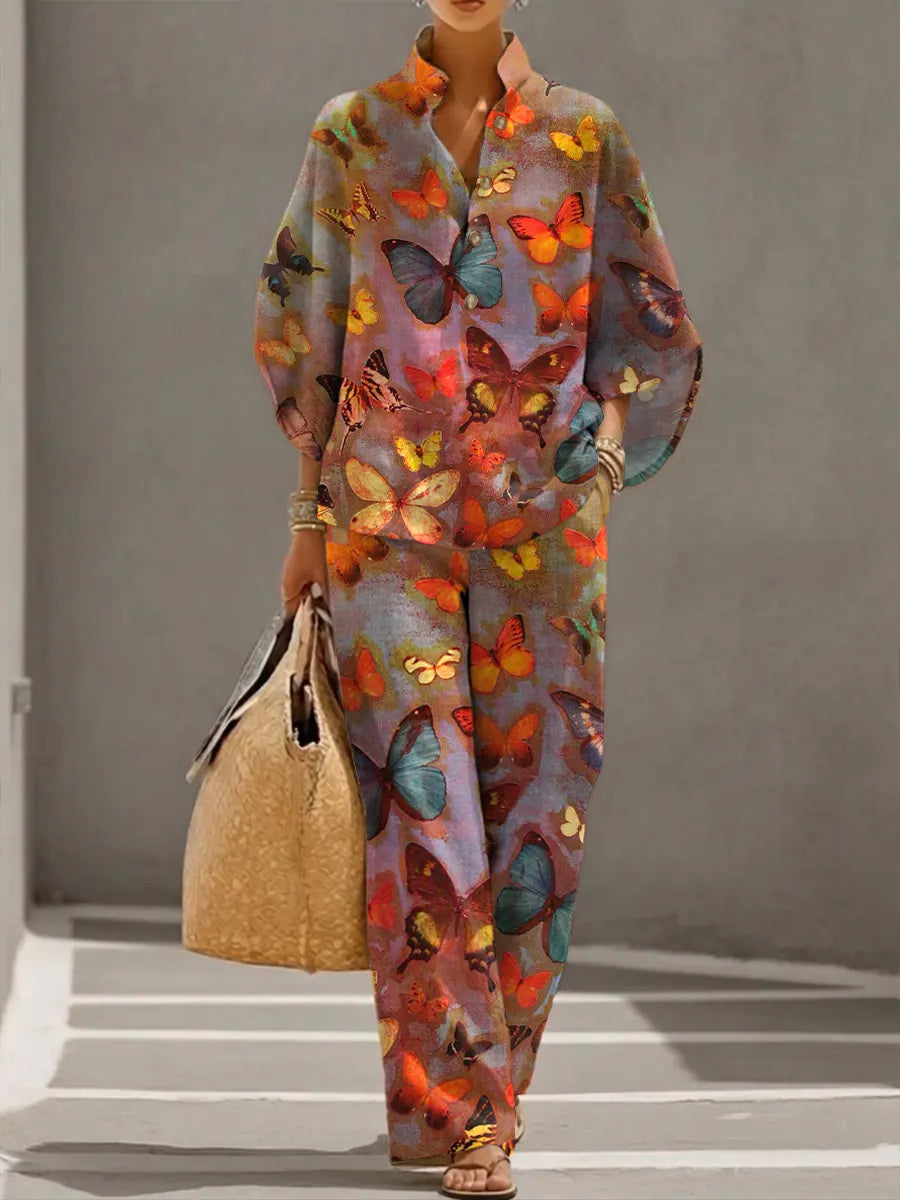 Women's Retro Butterfly Art Print Casual 3/4 Sleeve Top And Pants Cotton Linen Suits