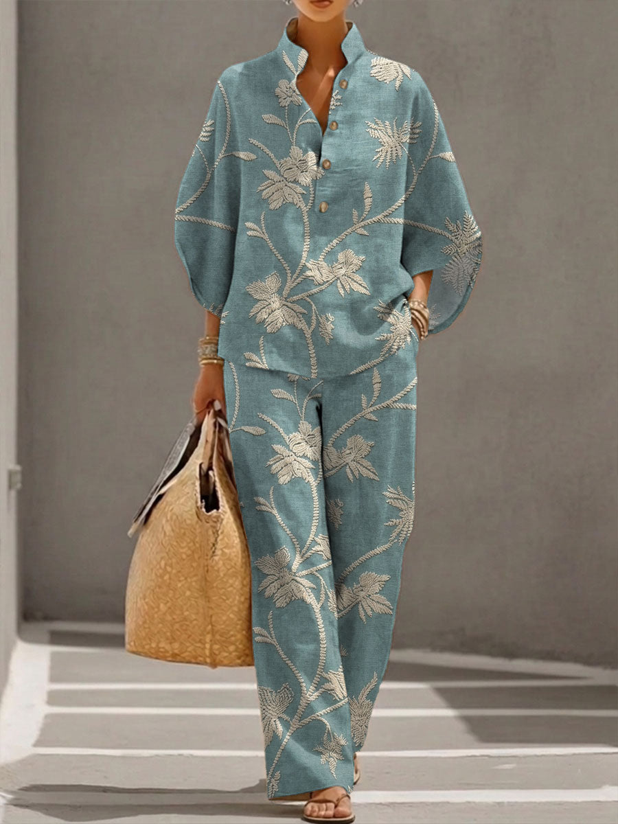 Women's Retro Floral Art Print Casual 3/4 Sleeve Top And Pants Cotton Linen Suits