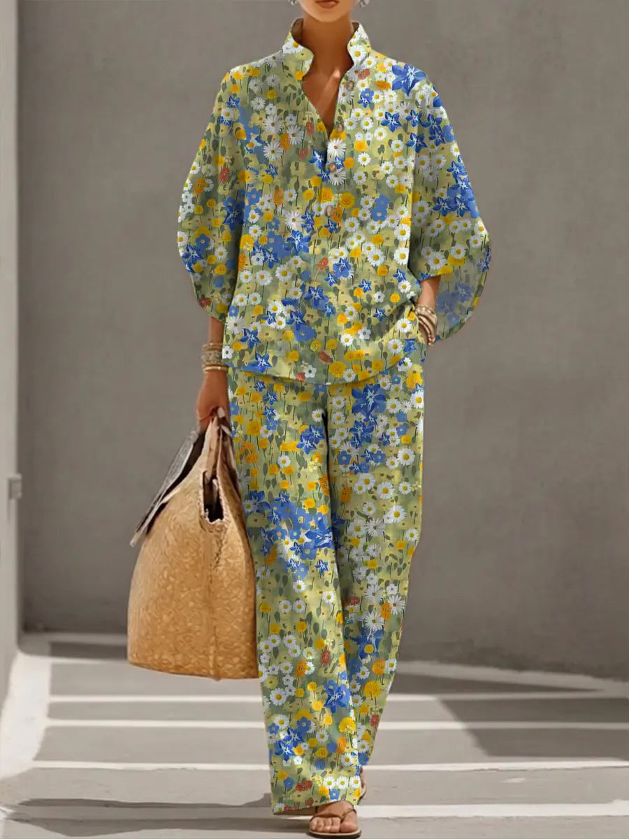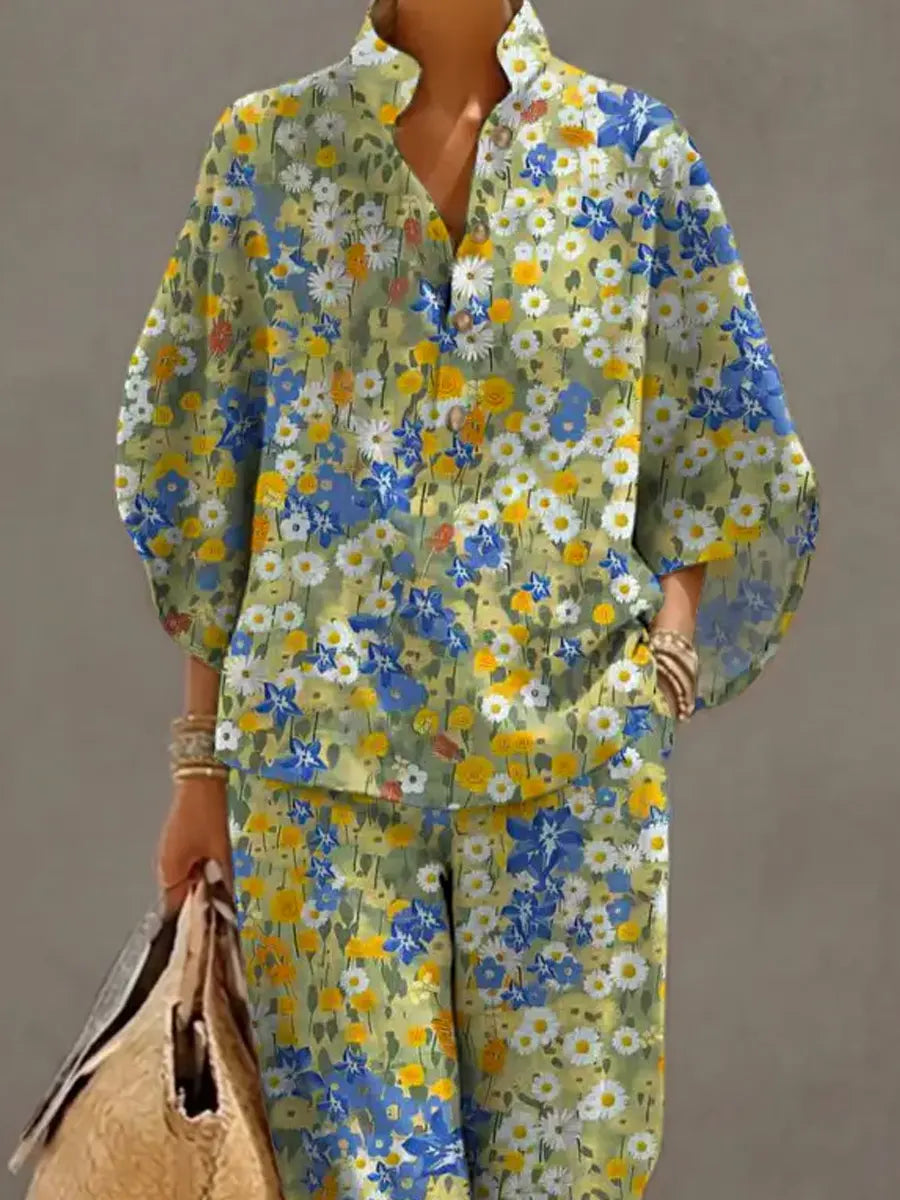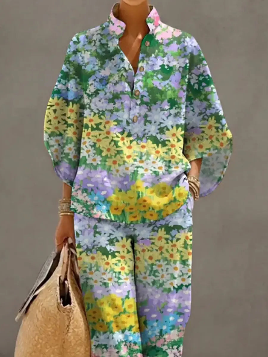 Women's Simple Small Floral Art Print Cotton And Linen Set