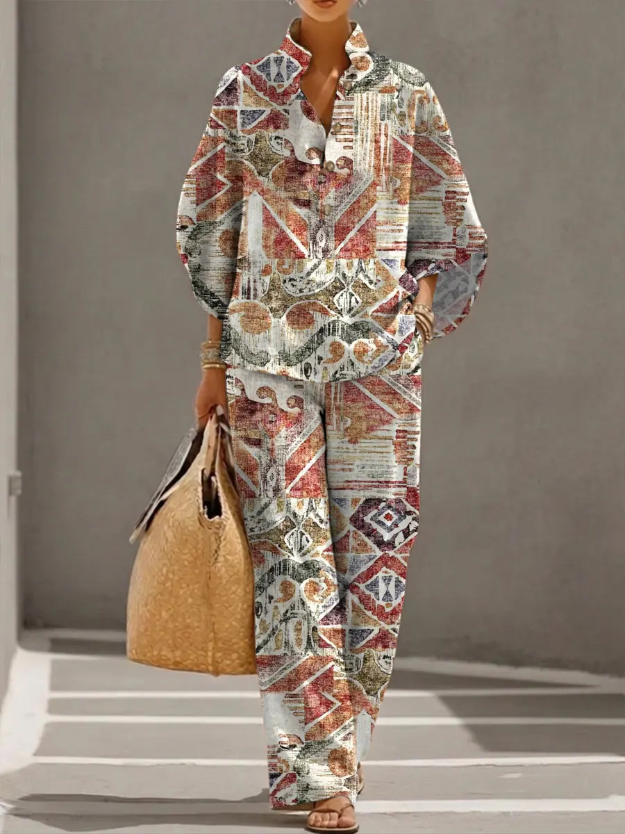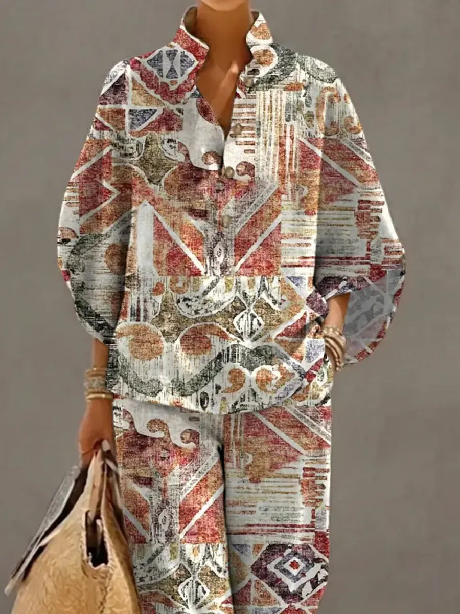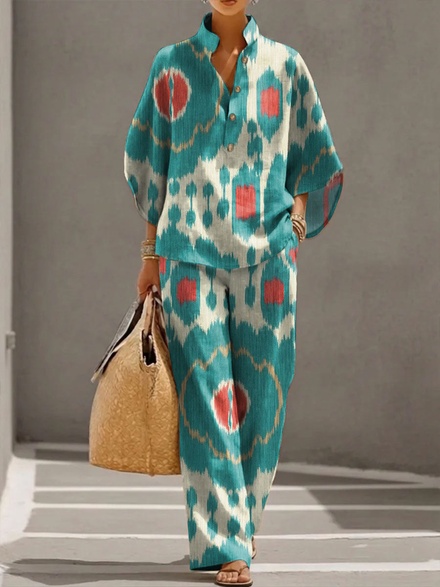 Women's Retro Ethnic Art Print Casual 3/4 Sleeve Top And Pants Cotton Linen Suits